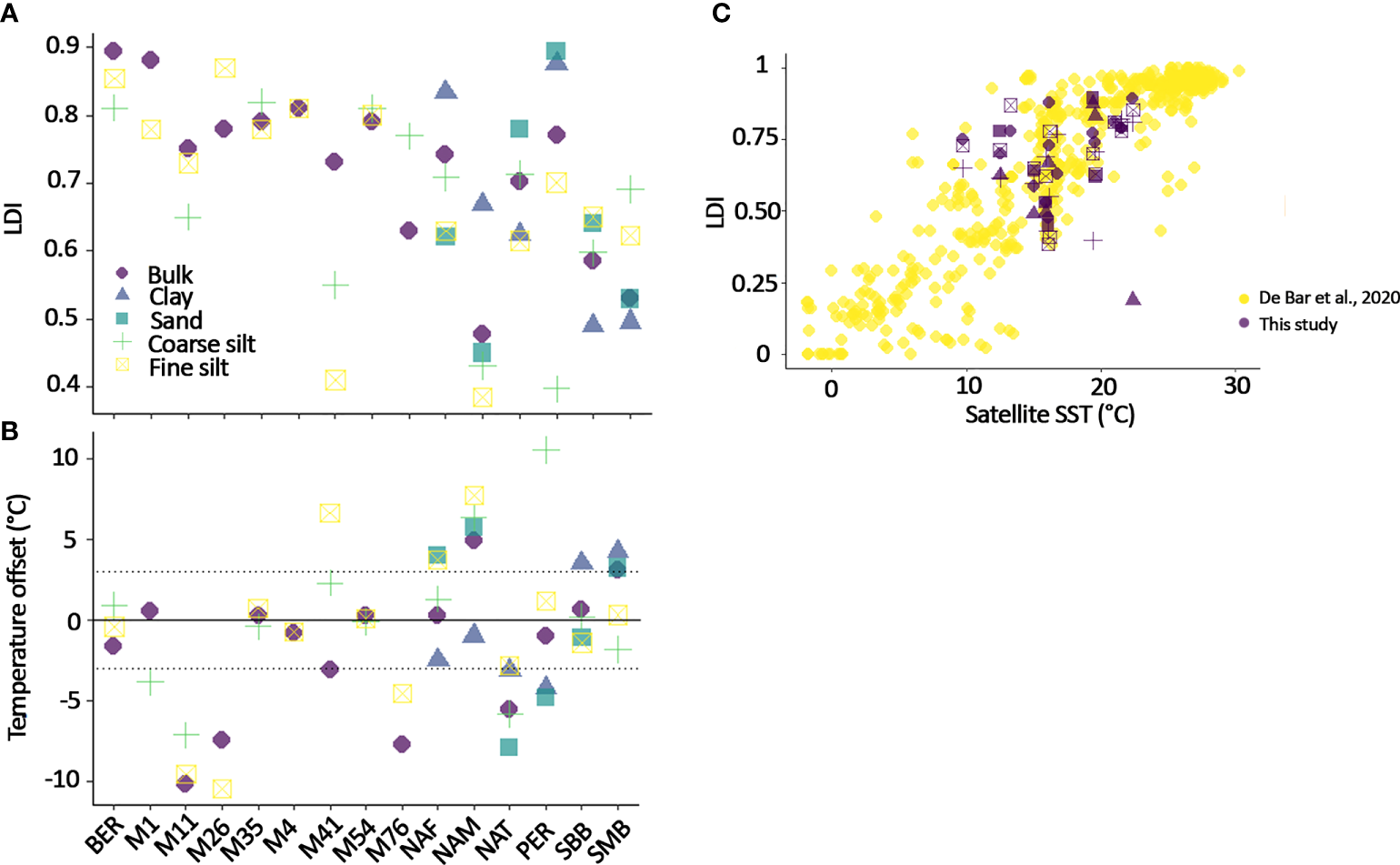 Figure 4 (A) LDI in fractions, (B) Offset with SST from World Ocean Atlas (WOA) 2018 (Locarnini et al., 2018) resulting from the difference between SST-WOA and LDI-SST, the dashed grey line indicates the error associated with the LDI calibration (± 3°C), and (C) LDI in our study compared with the global calibration of De Bar et al. (2020).