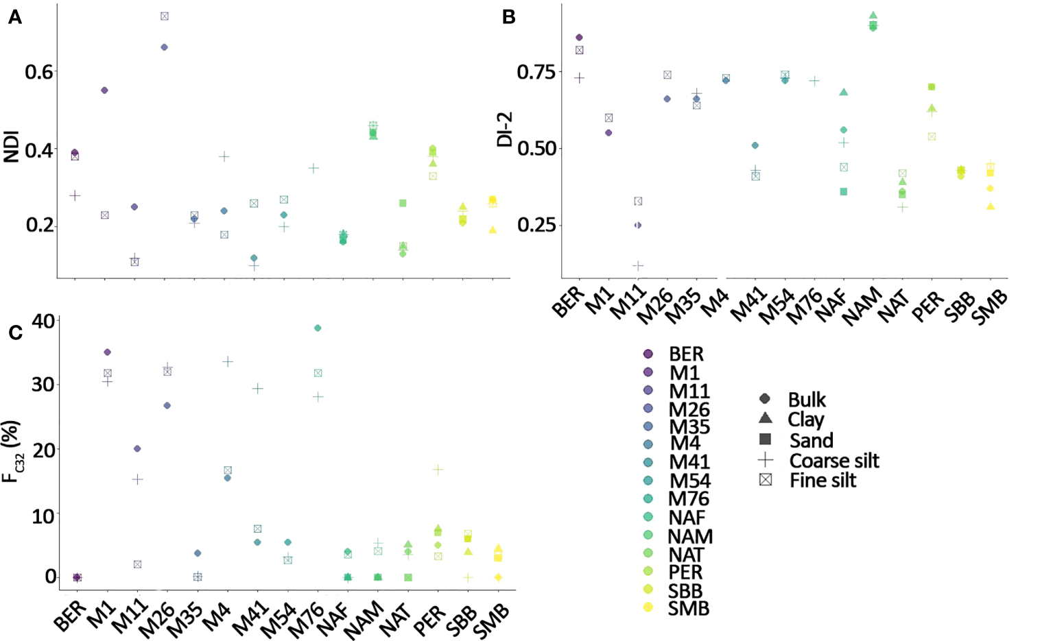 DI-2 Bulk DI-2 values vary from 0.25 in M11 to 0.89 in NAM (Figure 5B), with little difference between the fractions and the bulk, except for the sand and clay fractions in NAF (difference with the bulk DI-2 of 0.2 and 0.1, respectively).