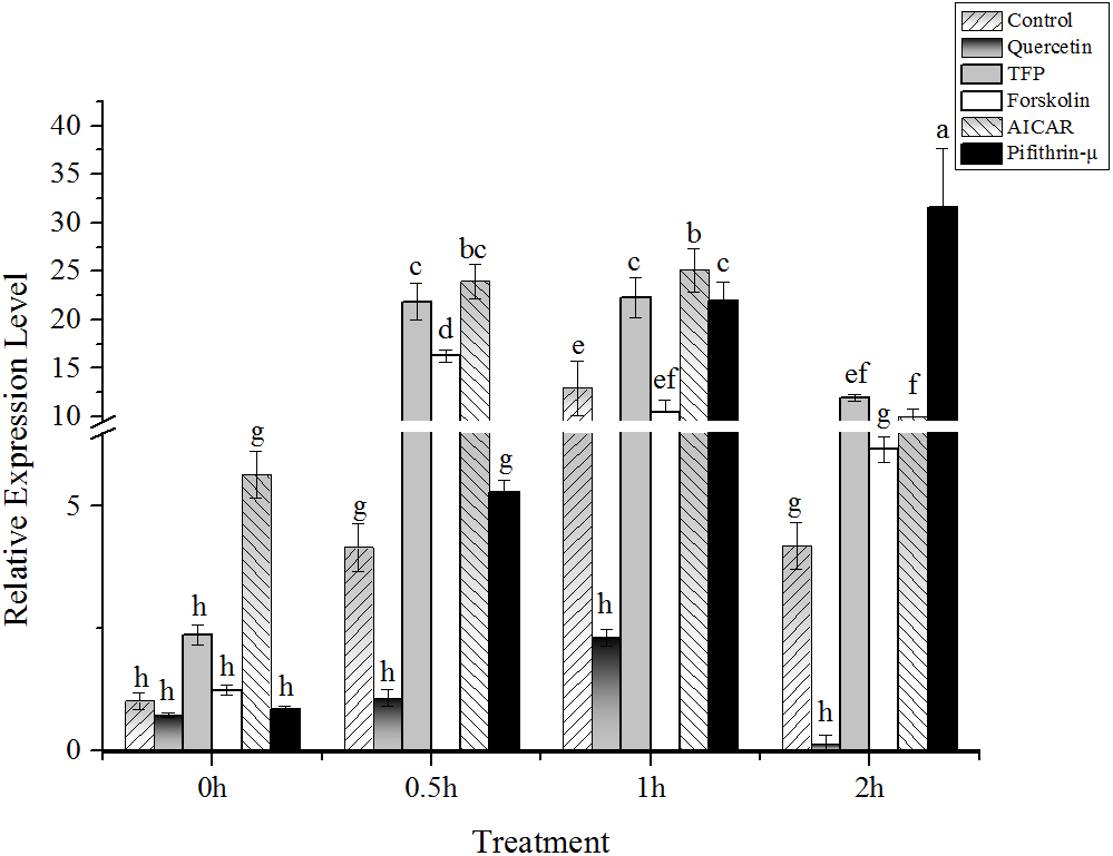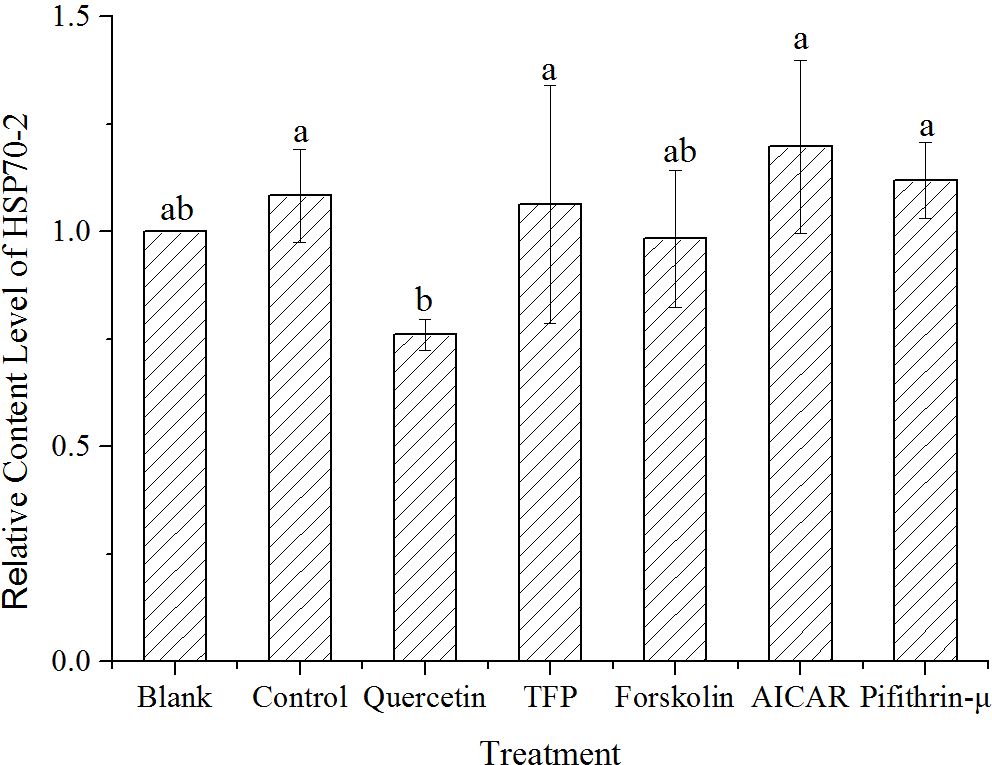Quantification of HSP70-2 protein by LC-MS/MS in samples treated with different chemicals after 1h high-temperature stress. The translational changes of HSP70-2 derived from the ratio of normalized target protein intensity by that of the control. Blank, incubated at 15°C, Control, stressed at 24°C for 1h, Quercetin, TFP, Foskolin, AICAR and pifithrin-μ represented the corresponding treatment at 24°C for 1h. Data were Mean ± SD (n=3). Different letters indicate significant differences (P<0.05).