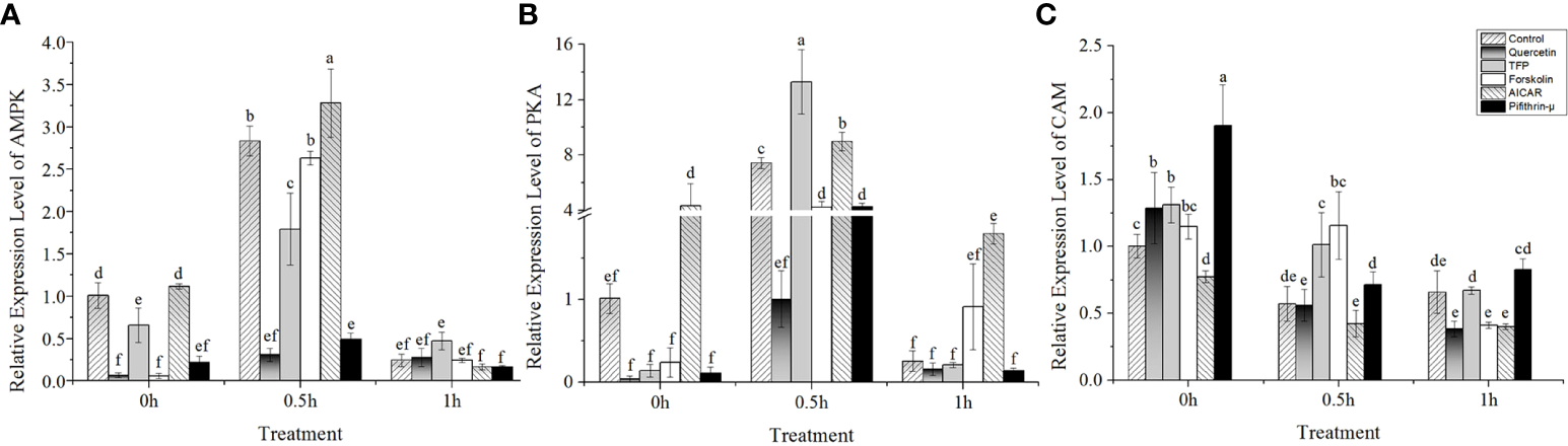 The results showed that under high temperature stress, the expression of AMPK and PKA was significantly upregulated at 24°C (Figures 3A, B). Interestingly, the expression of AMPK and PKA presented an upward trend after addition of AICAR before implementing heat stress (Figures 3A, B). Moreover, the profiles of both AMPK and PKA expression after treatment with AICAR were consistent with the control without chemical treatment. However, it seemed that the transcription of these two kinases was suppressed a little bit by forskolin except in the case of PKA under heat stress after 1h (Figures 3A, B). On the contrary, PKA was strongly induced by TFP during half an hour of heat stress, and pifithrin-μ also upregulated its expression compared with the control. Regardless of high temperature, quercetin and pifithrin-μ showed a suppressive effect on the expression of AMPK compared with the control. The variation in CaM gene expression showed that it was downregulated under high temperature stress (Figure 3C). The addition of quercetin, pifithrin-μ, forskolin, and TFP increased CaM expression before heat stress treatment, but it decreased rapidly under high temperature conditions and this downward trend continued with the duration of the stress applied.