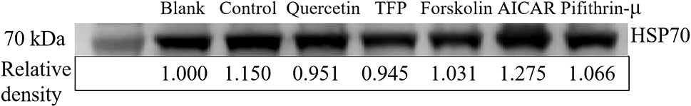 The immunoblotting results showed that a HSP70 was located near the molecular weight of 72 kDa (Figure 4). However, except for the slight upregulation in the samples treated only with high temperature and those in the AICAR group, the HSP70 level remained relatively stable under other chemical treatments (Figure 4). However, no significant variation in HSP70 proteins was found after treatment with quercetin and TFP. Hence, it was reasonable to believe that the bands indicated by immunoblotting were not only the target HSP70-2 protein but also other fractions of HSP70.