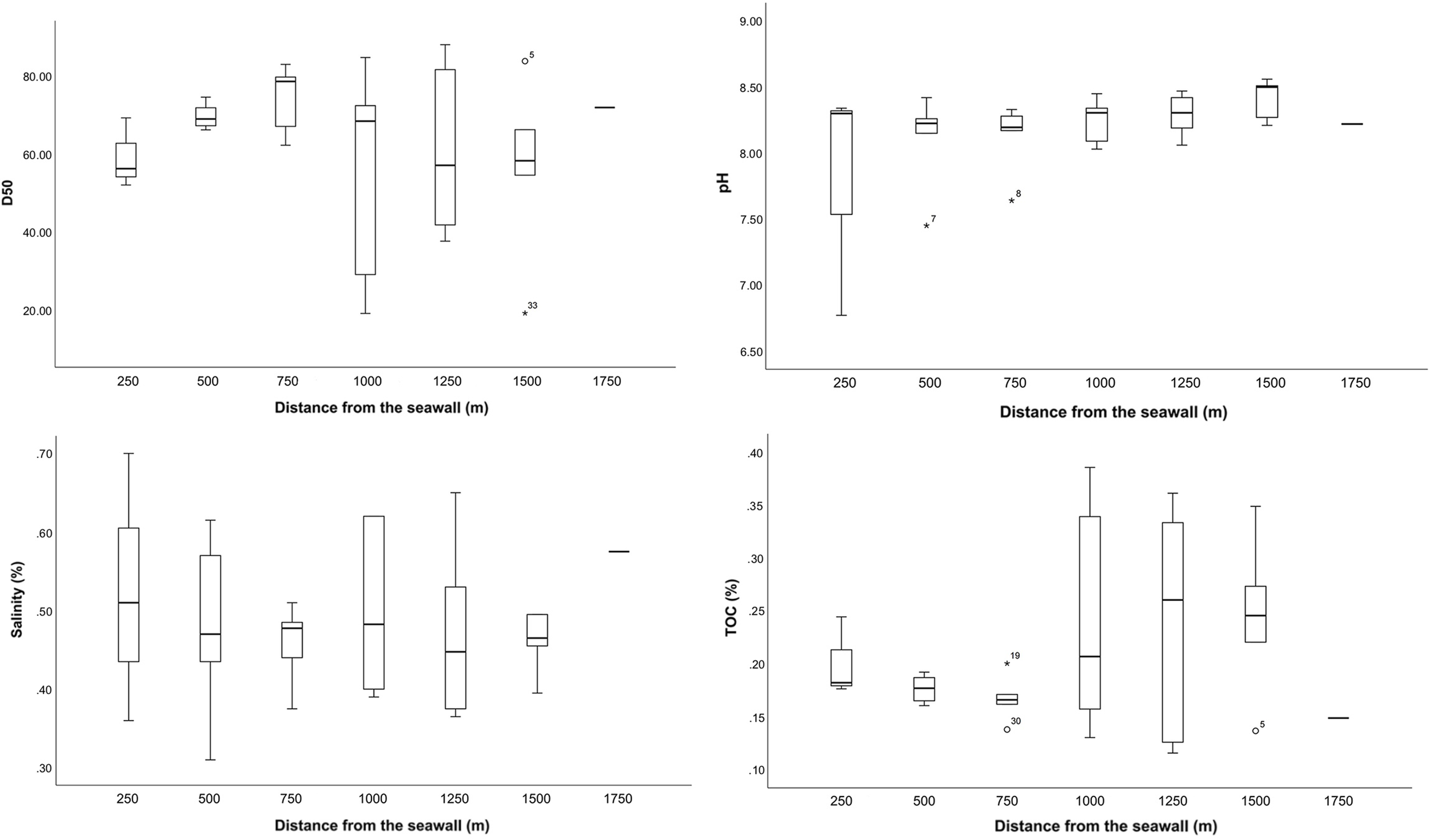 Median particle size (D50), pH, salinity, and total organic carbon (TOC) content of sediment samples. * symbol represents the extreme value in the data.