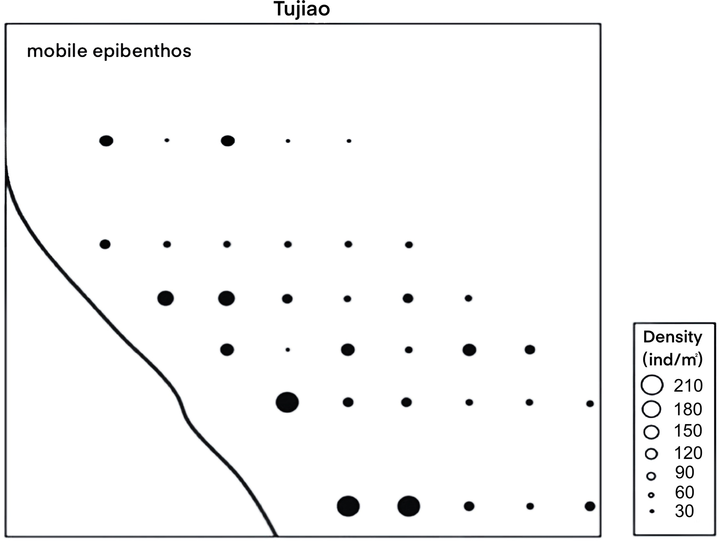 Three amphipod and cumacean species (Monoculodes koreanus, Diastylis tricincta, and Grandidierella japonica) were dominant among the mobile epibenthos collected, accounting for 85% of mobile epibenthic animals recorded. Among them, the average density of M. koreanus reached 48 ind/m2 and the species was distributed in 79% of the sampling stations, while the average density of D. tricincta reached 27 ind/m2 and the species was distributed in 70% of the sampling stations, and the average density of G. japonica reached 15 ind/m2 and the species was distributed in 64% of the sampling stations. Other species (shrimp, crabs, and other amphipods) were less abundant and had a relatively small distribution range. Among them, Philyra olivacea, P. minuta, Alpheus pacificus, Neoxenophthalmus obscurus, and Listriella curvidactyla were recorded in only 3% of the sampling stations, while Archaeomysis kokuboi was distributed in 33% of the sampling stations. The density of the two fish species was 0.6 ind/m2 and their frequency of occurrence in the sampling stations was 6%.
