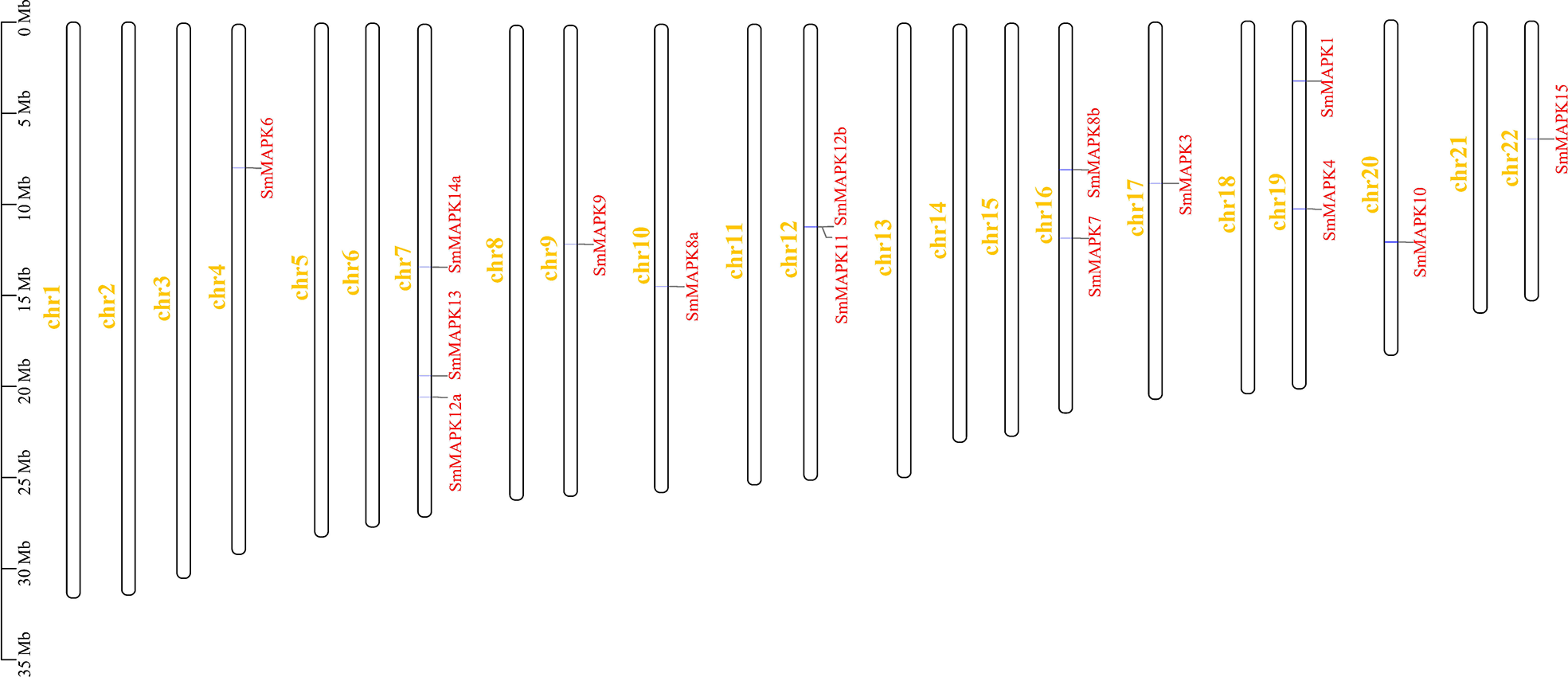 Chromosomal distribution of Scophthalmus maximus mitogen-activated protein kinase (MAPK) genes. The MAPK genes and chromosomes are highlighted in red and yellow, respectively.