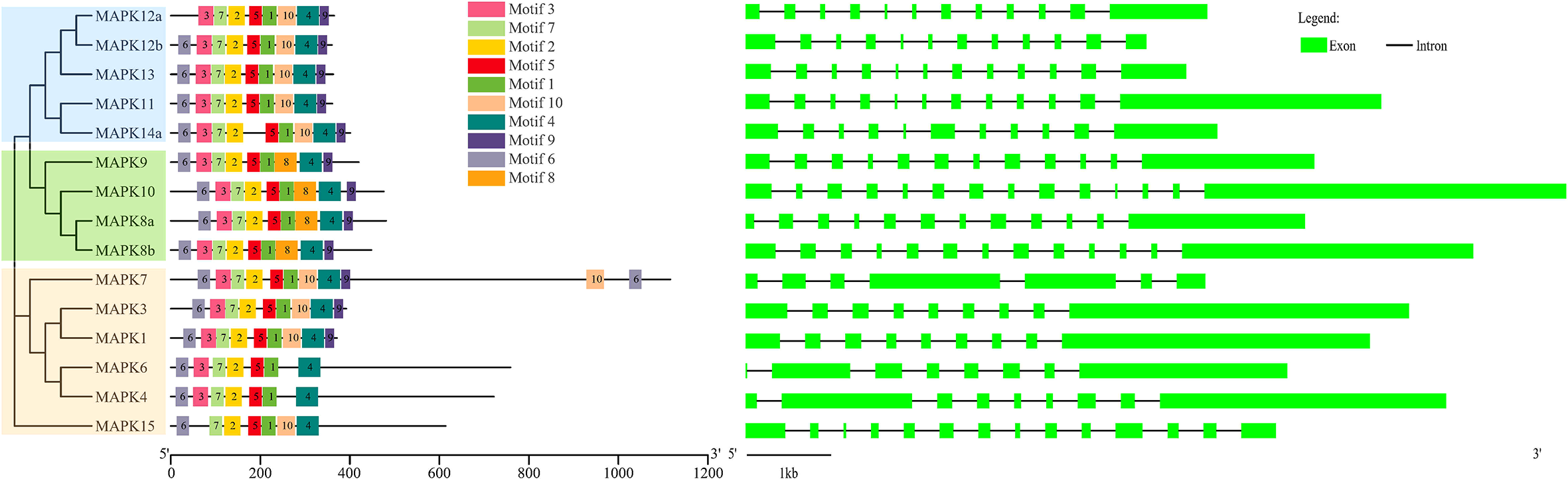 The combination of phylogenetic relationship, conserved motif, and exon–intron structure. The left of the graph shows the phylogenetic relationships. The middle of the graph shows the distribution of conserved motifs, and each colored rectangular box represents a motif. The right of the graph shows the exon–intron structure, and the lengths of introns in each SmMAPK are displayed in the same length.