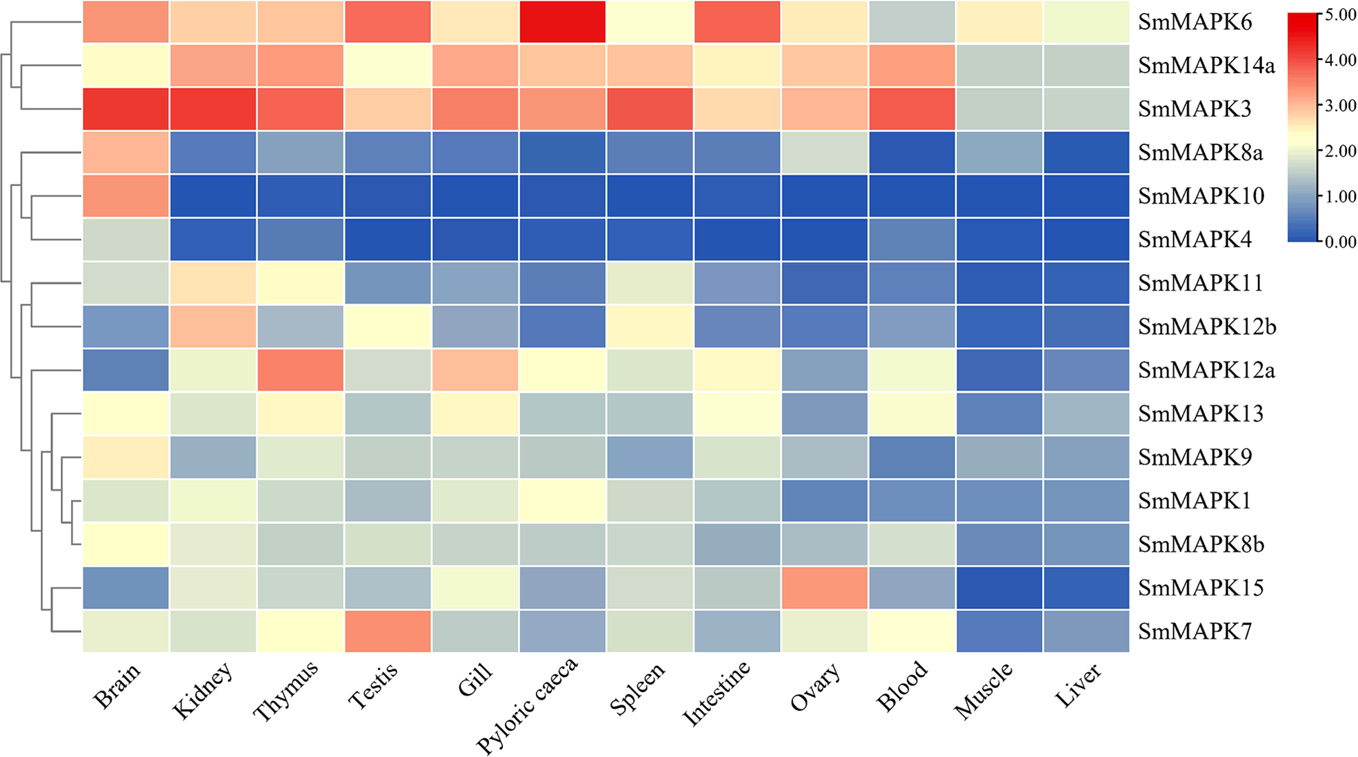 The expression patterns of all SmMAPK members in 12 different tissues are shown in Figure 4. The expression data of SmMAPKs are provided in Supplementary Table 6. On the whole, MAPKs were widely expressed in all 12 tissues and, meanwhile, differentially expressed in some tissues. In detail, MAPKs showed the highest global expression levels in the brain, relatively higher global expression levels in the thymus and kidney, and the lowest global expression levels in the liver and muscle. Moreover, the global expression levels of SmMAPK3, 6, and 14a were higher than other members in almost all tissues. In addition, some genes presented obviously tissue-specific expression patterns; for instance, the expression of SmMAPK10, 4, and 8a was almost only detected in the brain. SmMAPK7, 15, 12a, and 12b showed higher expression levels than other members in the testis, ovary, thymus, and kidney, respectively.