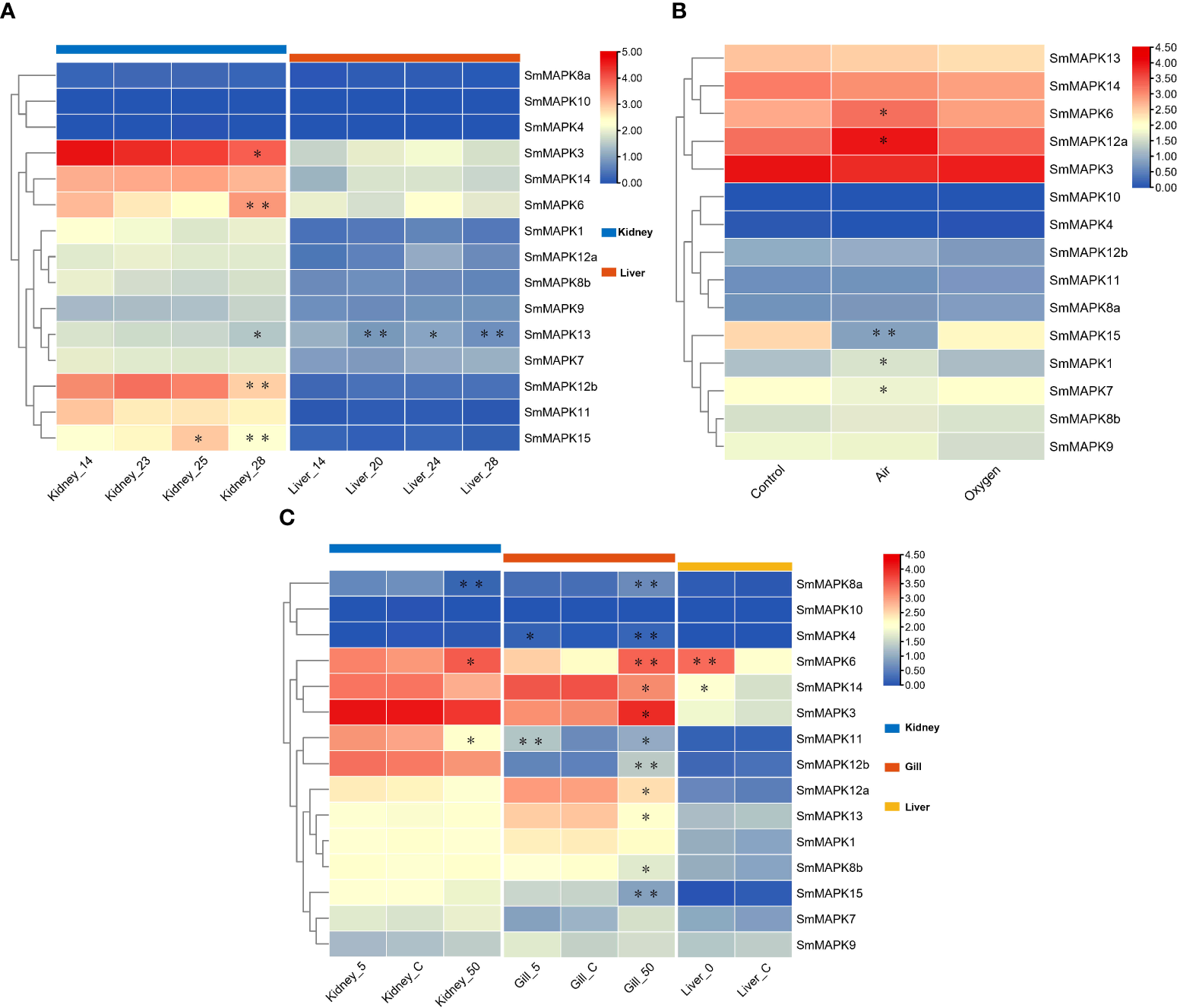 Heat map of mitogen-activated protein kinase (MAPK) expression in Scophthalmus maximus under three abiotic stresses. (A) Expression of MAPKs in kidney and liver tissues under heat stress: 14 °C: control group; 20 °C, 23 °C, 24 °C, 25 °C, and 28 °C: heat stress group. (B) Expression of MAPKs in gill tissues under oxygen stress: Control: 6.5 mg/L of O2, water; Air: 300 mg/L of O2, waterless; and oxygen: 1,430 mg/L of O2, waterless. (C) Expression of MAPKs in kidney, gill, and liver tissues under salinity stress: Control: 30‰ salinity (natural seawater); 50: 50‰ salinity; 5: 5‰ salinity; and 0: fresh water. Each cell with a different color corresponds to a different expression level, which was normalized into log2 (FPKM + 1). *Significantly differentially expressed MAPKs with P < 0.05. **Extremely significant differential expression of MAPKs with false discovery rate (FDR) < 0.01 and |log2 fold change (FC)| > 1.