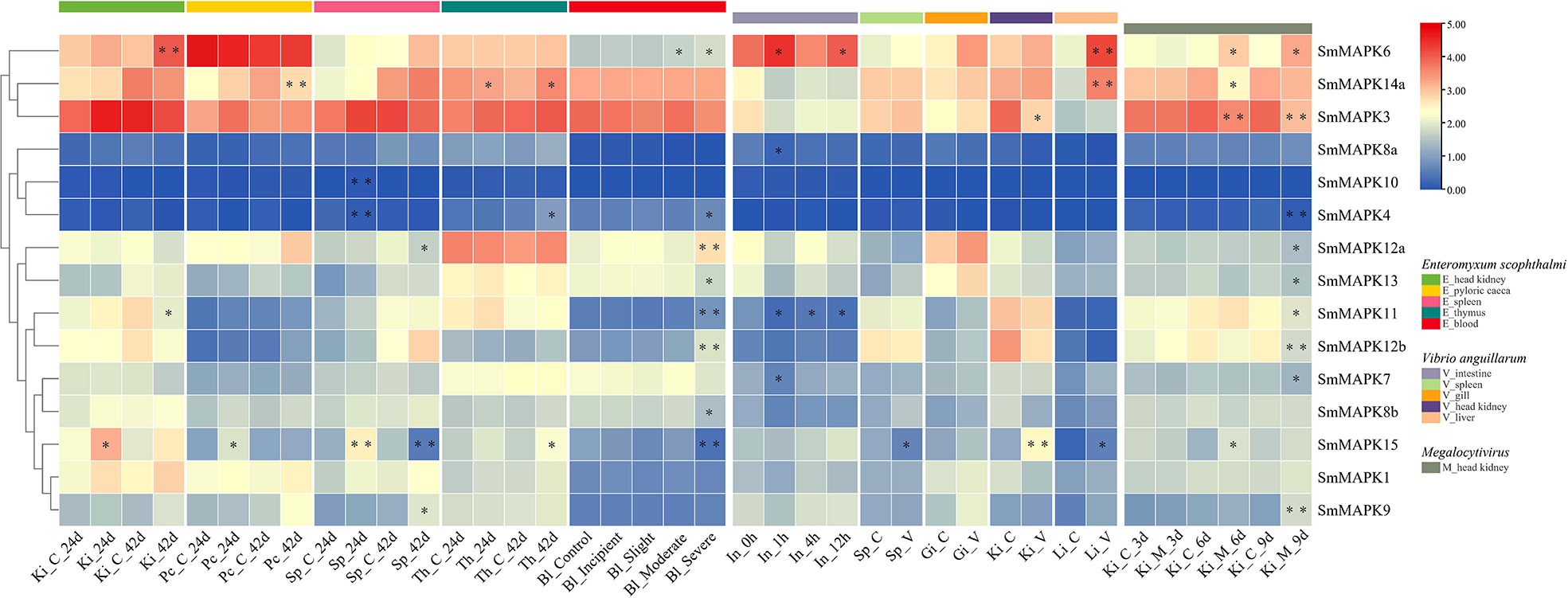 Heat map of mitogen-activated protein kinases (MAPK) expression in Scophthalmus maximus under pathogen (Enteromyxum scophthalmi, Vibrio anguillarum, and Megalocytivirus) infection. Ki, Pc, Sp, Th, Bl, In, Gi, and Li represent the head kidney, pyloric caeca, spleen, thymus, blood, intestine, gill, and liver, respectively. C represents the control group, V represents the V. anguillarum infection, and M represents the Megalocytivirus infection. Each cell with a different color corresponds to a different expression level, which was normalized into log2 (FPKM + 1). *Significantly differentially expressed of MAPK genes with P < 0.05. **Extremely significant differential expression of MAPK genes with false discovery rate (FDR) < 0.01 and |log2 fold change (FC)| > 1.