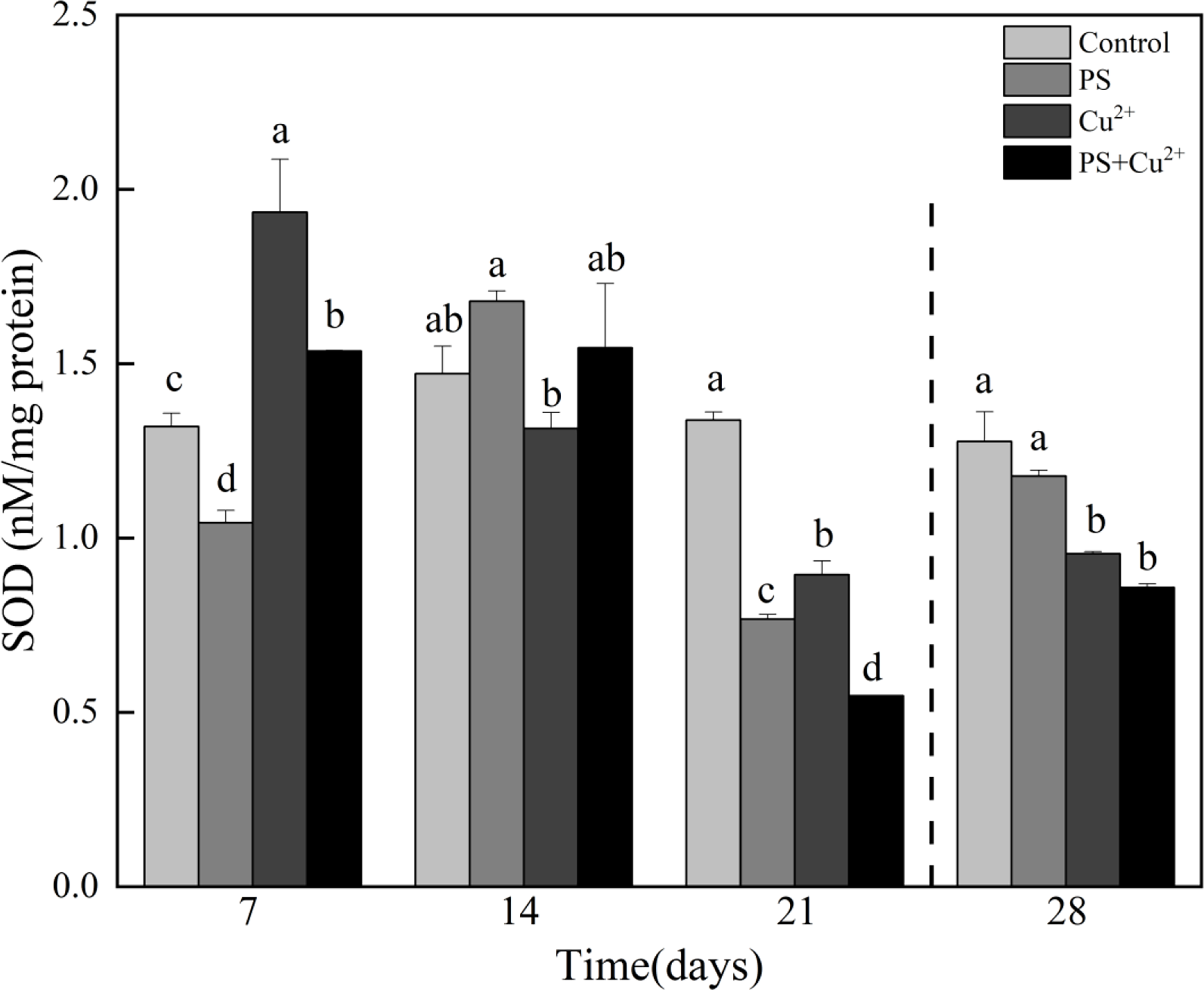 Superoxide dismutase (SOD) activities in whole tissues of Tachypleus tridentatus exposed to 100-nm micro-PS (104 particles l-1), Cu2+ (10 µg l-1), and a combination of PS and Cu2+ at days 7, 14, and 21, allowed to recover for 7 days (28 days). Data are provided as mean values ± standard deviations. The superscripts of different lowercase letters indicate significant differences (p < 0.05) between the four groups.