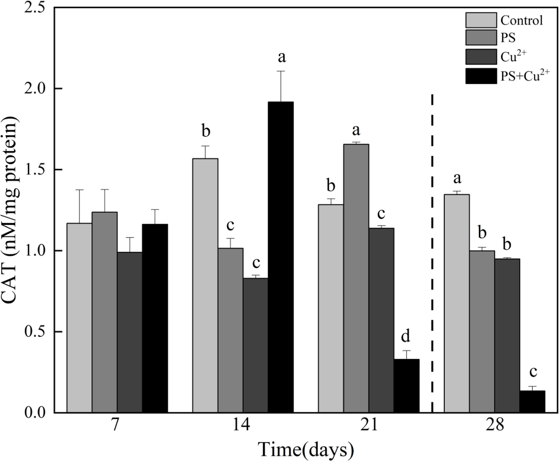 Catalase (CAT) activities in whole tissues of Tachypleus tridentatus exposed to 100-nm micro-PS (104 particles l-1), Cu2+ (10 µg l-1), and a combination of PS and Cu2+ at days 7, 14, and 21, allowed to recover for 7 days (28 days). Data are shown as mean values ± standard deviations. The superscripts of different lowercase letters indicate significant differences (p < 0.05) between the four groups.