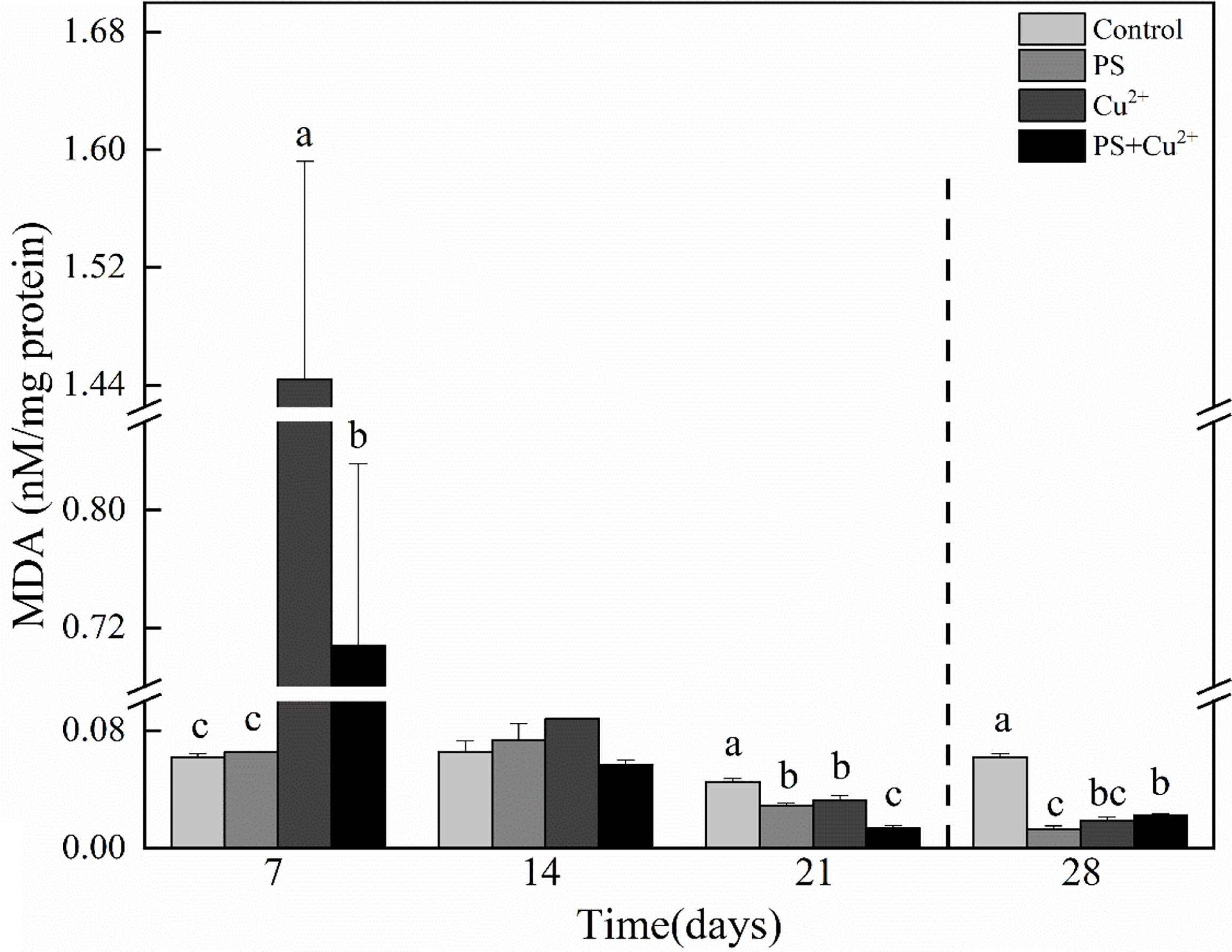 Malondialdehyde (MDA) activities in whole tissues of Tachypleus tridentatus exposed to 100-nm micro-PS (104 particles l-1), Cu2+ (10 µg l-1), and a combination of PS and Cu2+ at days 7, 14, and 21, allowed to recover for 7 days (28 days). Data are presented as mean values ± standard deviations. The superscripts of different lowercase letters indicate significant differences (p < 0.05) between the four groups.
