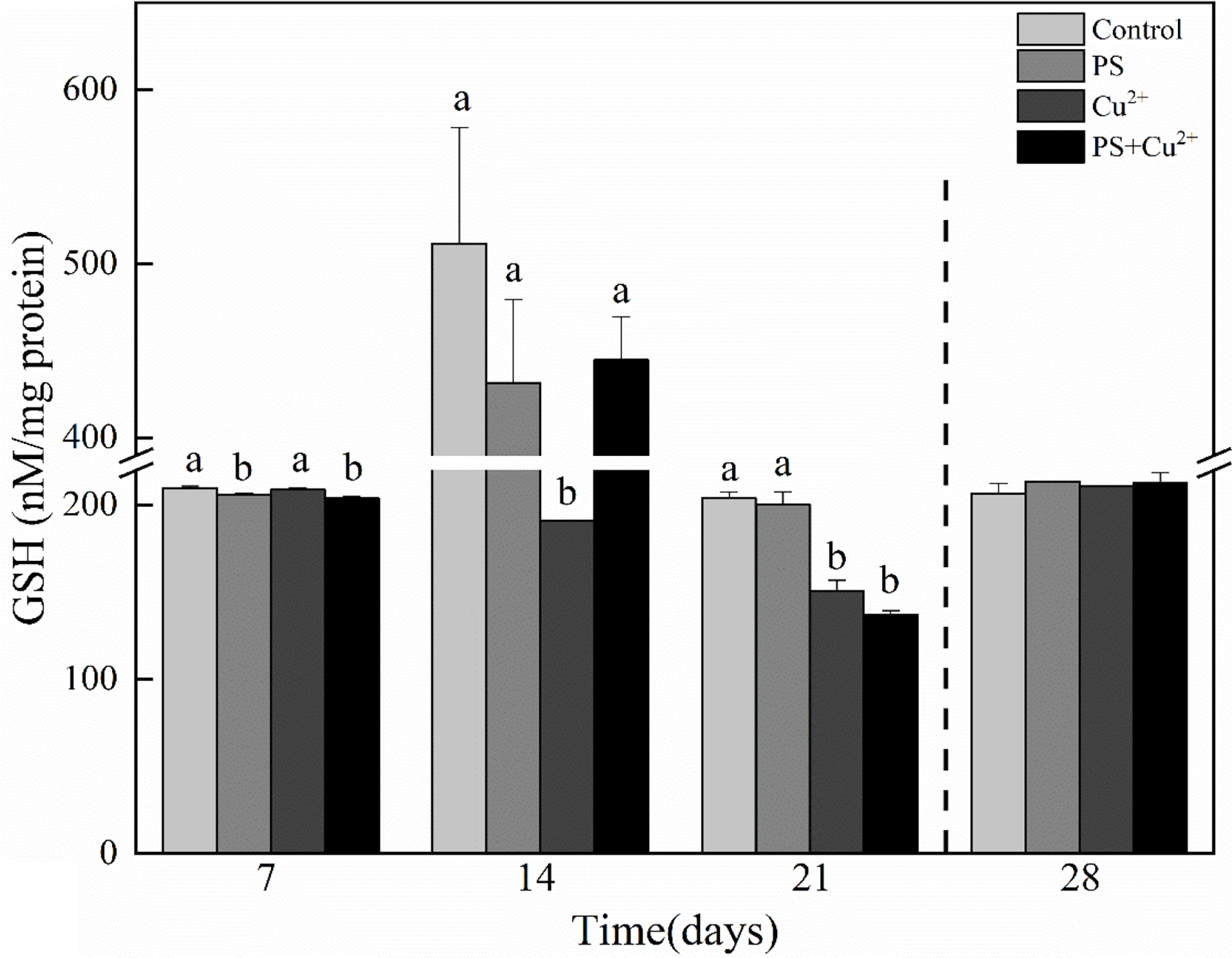 Glutathione (GSH) activities in whole tissues of Tachypleus tridentatus exposed to 100-nm micro-PS (104 particles l-1), Cu2+ (10 µg l-1), and a combination of PS and Cu2+ at days 7, 14, and 21, allowed to recover for 7 days (28 days). Data are given as mean values ± standard deviations. The superscripts of different lowercase letters indicate significant differences (p < 0.05) between the four groups.