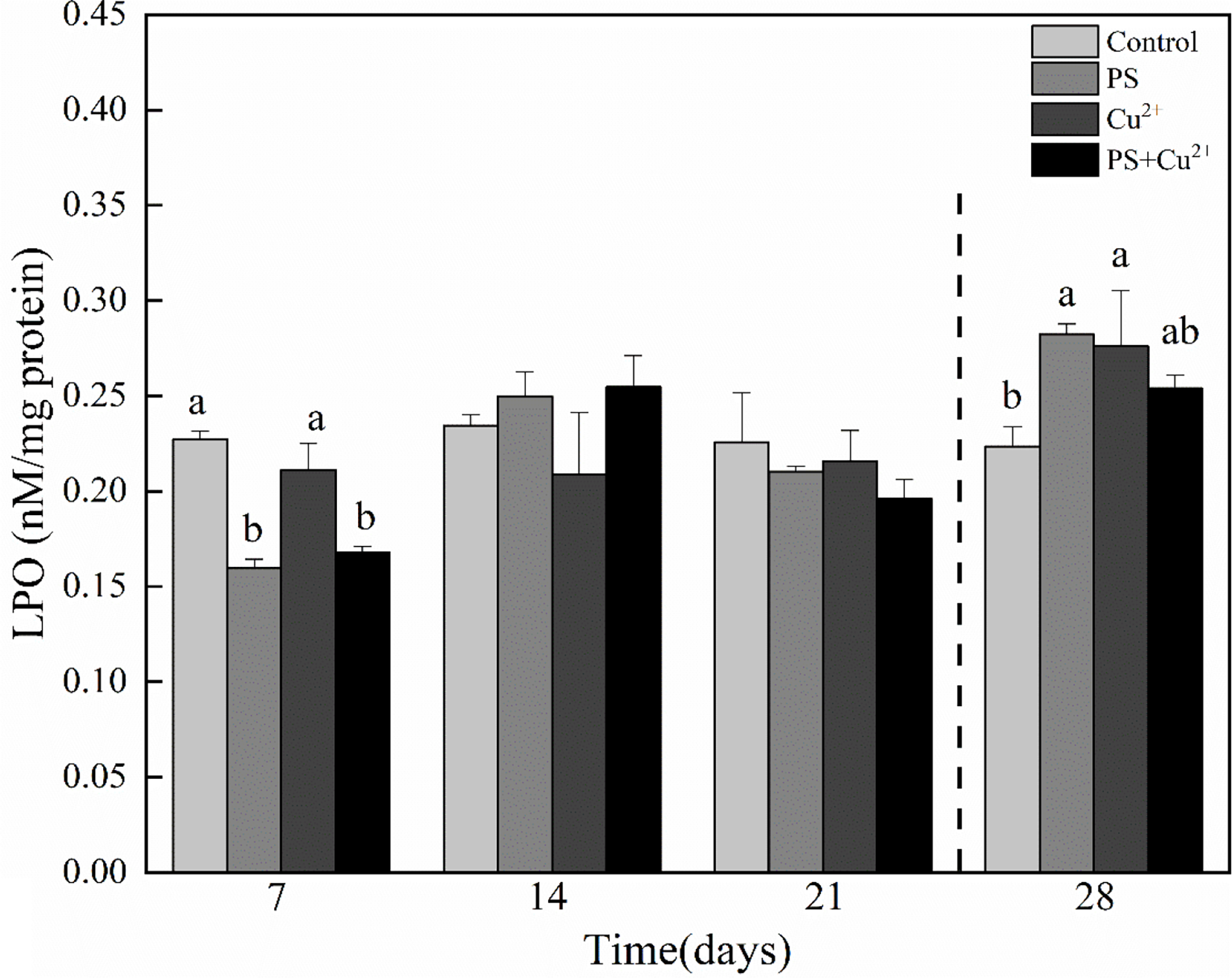 Lipid peroxidation (LPO) activities in whole tissues of Tachypleus tridentatus exposed to 100-nm micro-PS (104 particles l-1), Cu2+ (10 µg l-1), and a combination of PS and Cu2+ at days 7, 14, and 21, allowed to recover for 7 days (28 days). Data are given as mean values ± standard deviations. The superscripts of different lowercase letters indicate significant differences (p < 0.05) between the four groups.
