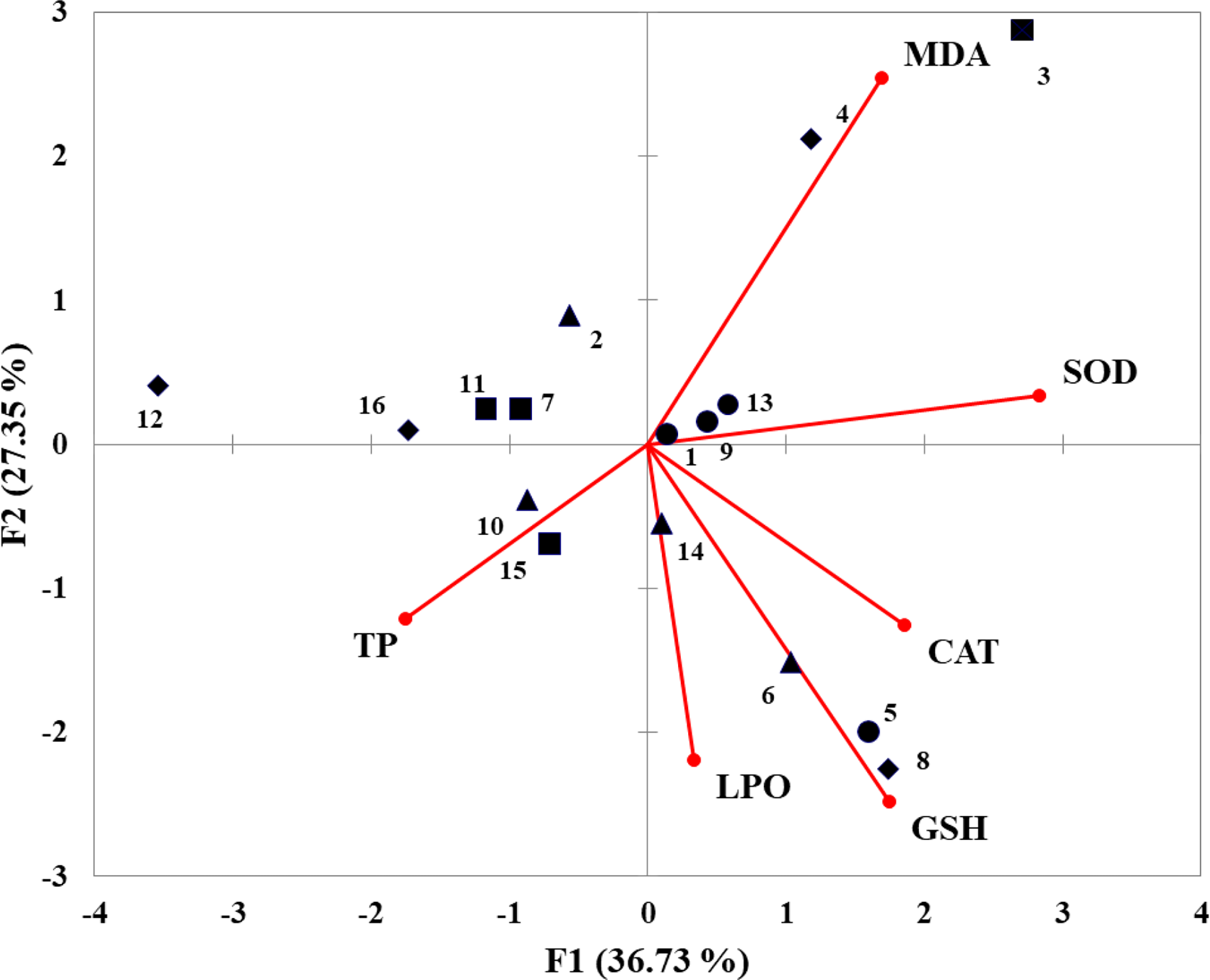 Biplot of principal component analysis with all measured variables (TP, SOD, CAT, MDA, GSH, LPO) at five different time points (days 7, 14, 21, and 28) in five different treatments (●artemia only with 0 conc., ▲nano-PS 104 particles l-1 conc., ■Cu2+ 10 µg l-1 conc., ♦ nano-PS + Cu2+).