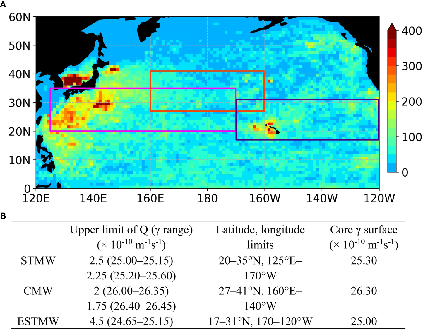 The criteria for water mass properties are often influenced by different periods or datasets; therefore, we defined the mode waters by their fundamental feature or a lateral minimum in potential vorticity (Q) (Hanawa and Talley, 2001).