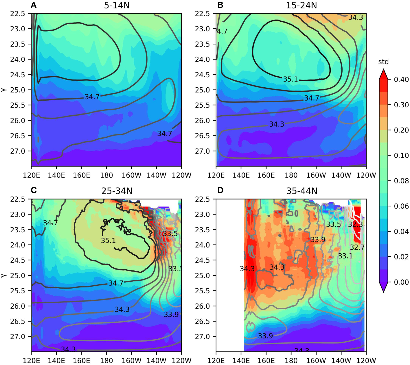 Climatology (contour) and standard deviation (color) of the salinity during 2004–2018 with respect to neutral density (unit = kg·m−3), which were averaged in (A) 5–14°N, (B) 15–24°N, (C) 25–34°N, and (D) 35–44°N. Contour interval is 0.2. The grids in the Sea of Japan are whitened in (D).