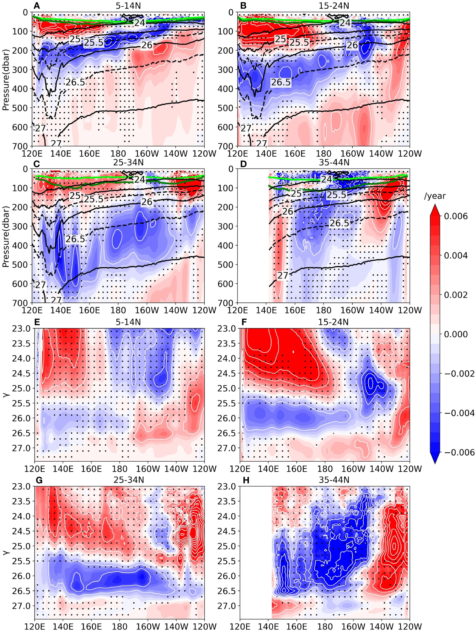 Linear trend of salinity (color and white contours were every 0.002) (unit = year−1) with respect to (A–D) pressure and (E–H) γ during 2004–18, which were averaged in (A) and (E) 5–14°N, (B) and (F) 15–24°N, (C) and (G) 25–34°N, and (D) and (H) 35–44°N. Stippled grids indicate where a trend was insignificant at 95% confidence level. In (A–D), the light and dark green lines represent all-season mixed layer depths and depths in February–March, respectively. The black contours indicate a climatological neutral density (unit = kg·m−3).