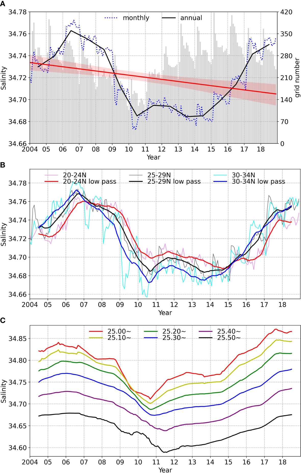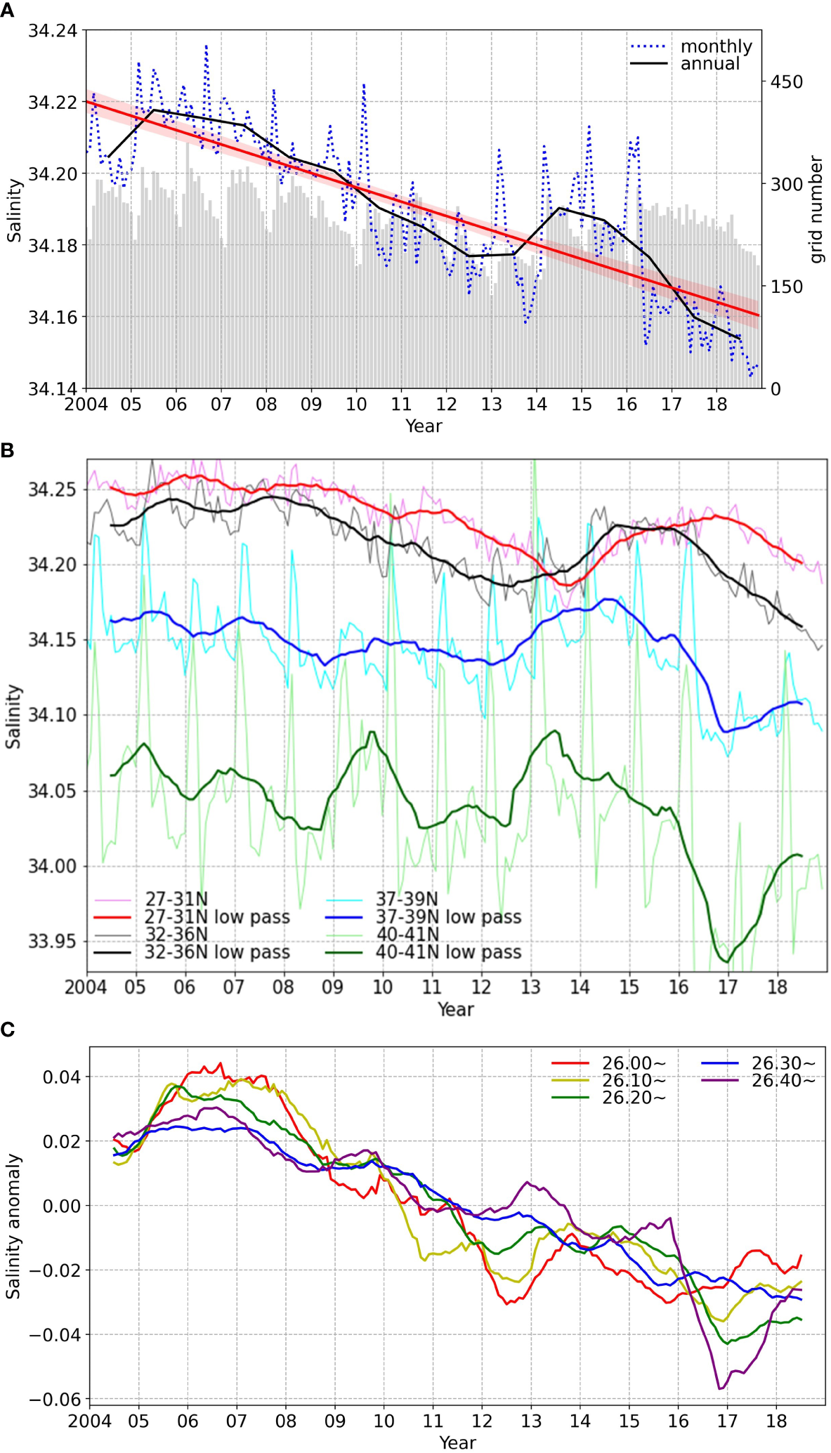 While the middle and southern parts of the CMW (27–36°N) were essentially homogeneous for both salinity and salinity changes with a 1-year lag, the northern part that was also in the formation region of the CMW (37–39°N) showed a much lower salinity (i.e., 0.05 and 0.15 lower in 32–36°N and 40–41°N, respectively compared to the middle to southern parts). This part also showed much larger seasonal variations and more significant year-to-year variations, which obscured its decadal variability (Figure 6B). These result from the strong climatological salinity gradients that existed north of 39°N. The interannual variations on the northern side were preserved up to the southern side with a total delay of about 2 years. The year-to-year variations were dampened significantly; thus, the decadal variability and trend were more significant. For example, the salinity increased at >0.06 and peaked in 2009 within 40–41°N. It increased by 0.02 within 37–39°N and was flat during 2009–2010 within 32–36°N. These will be discussed in section 3.3.