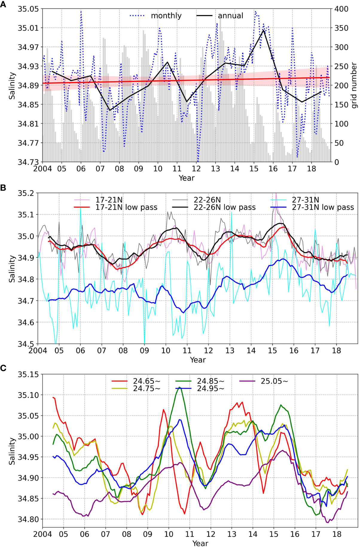 Salinity in the STMW was dominated by a quasi-decadal variability. Its seasonal variability was smaller compared to interannual or longer variability (Figure 5A). The peak and trough of the STMW salinity were in 2006 and 2010 with a difference of ~0.1, which was consistent with the clear freshening of the STMW during 2009–2010 (Sugimoto et al., 2013) and freshening of the northwestern Pacific at σθ = 24.5–25.4 during 2003–2012 (Yan et al., 2017). The linear trend observed during 2004–2018 was −0.002/year and failed the 95% significance test. This trend was consistent with that found during 1967–2016 along the 137°E section (Oka et al., 2017) and weaker than that found during 1997–2016 (−0.005/year) (Oka et al., 2017) and 1987–2012 (−0.004/year) (Nan et al., 2015) along the same section. Although it is difficult to separate the decadal variability from the peak to trough and the freshening trend in the considered 15-year period, the value of the linear trend obtained is in favor of a long-term weak freshening that was superimposed by a decadal variability. This contrasts with the more recent rapid freshening observed in previous studies. In addition, in the vertical diagram of salinity trends (Figure 4), the freshening in the density range of the STMW is not significant and lighter than the density range of significant freshening.