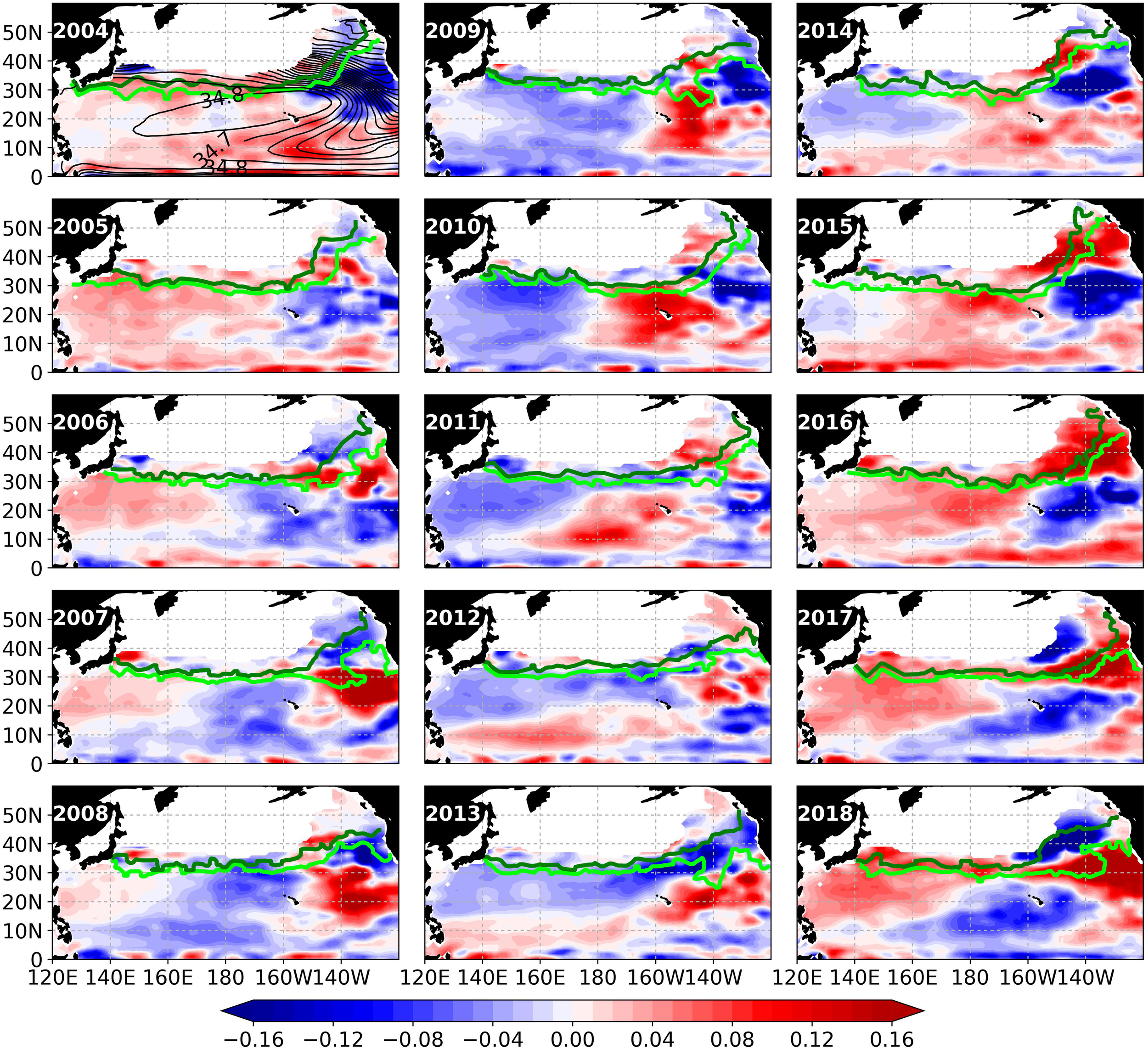 Around the region of the STMW (Figure 8), positive (negative) salinity anomalies >0.004 (<−0.004) appeared initially in 2004 (2009) near the outcrop line (30–35°N) in both the 140–150°E and the central longitudes (160°E–160°W). The former was in the STMW formation area, while the latter was beyond the eastern boundary of the STMW formation area, which was 175°E (Oka and Suga, 2003), and beyond the low Q boundary in the monthly Q maps (see Supplementary Material Figure 1). The anomalies were found to spread southwestward to the entire domain of the STMW in 2005–2006 (2010–2012). They then weakened gradually in the same direction from northeast to southwest sides during 2007–2009 (2012–2015). At the end of the data period, new positive anomalies appeared in 2016, which were found to spread to the entire STMW region in 2018. The path of southwestward propagation of the anomalies was generally consistent with the streamlines in the region (Figure 3); however, it was closer to the inner part of the streamlines, which suggested cross-streamline spreading.