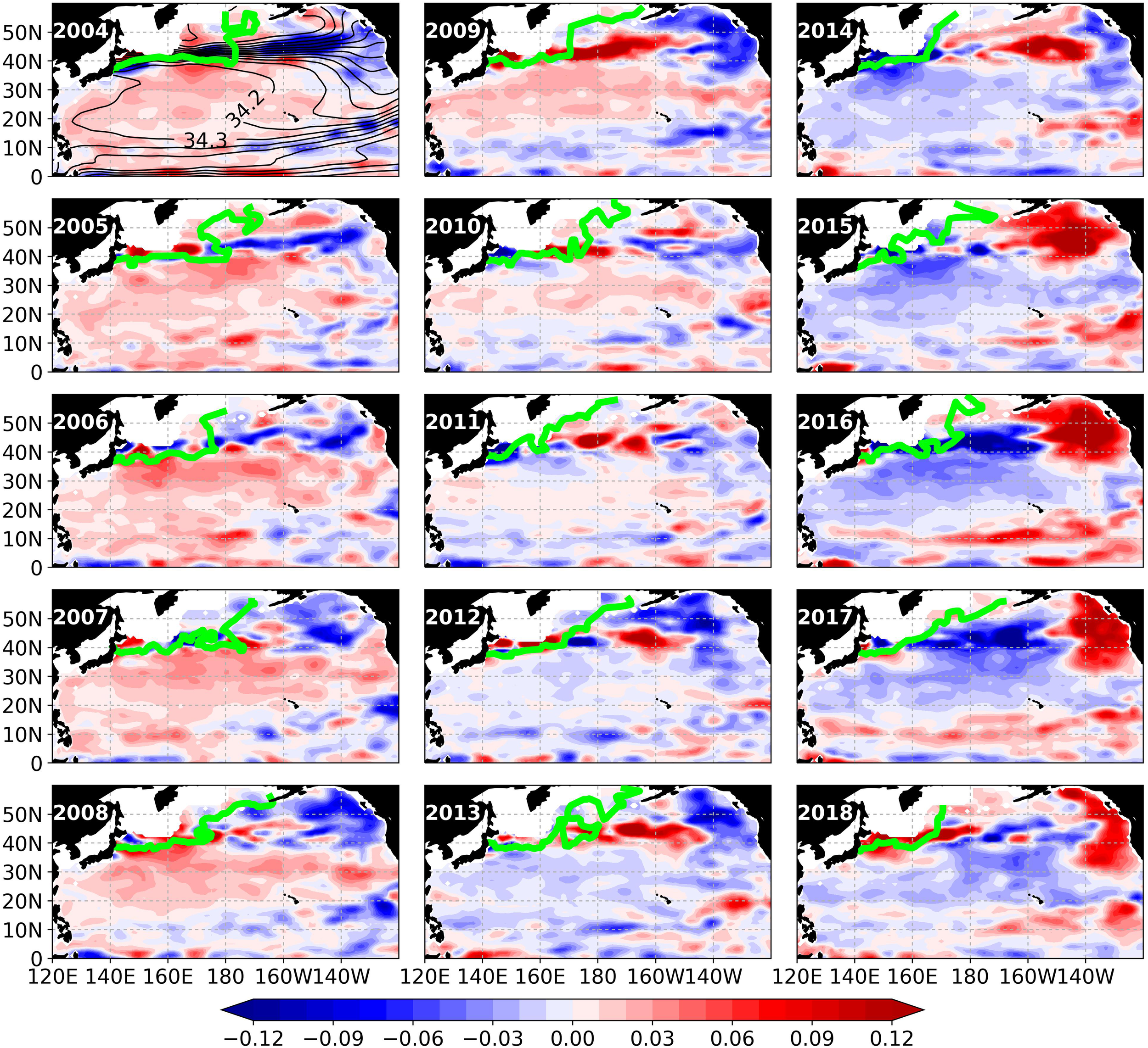 In the ESTMW (Figure 8), the salinity anomaly in each positive or negative period appeared initially at 150–130°W near the outcrop line (30–40°N), which was near the northern part of the ESTMW formation region (centered at 30°N, 140°W). The anomalies spread initially clockwise to the domain of the ESTMW (centered at 25°N, 140°W) in 1–2 years and then southwestward to the dateline around 20°N. They finally arrived at the western boundary of the tropics (near 10°N, 125°E). The propagation path was consistent with the direction of geostrophic streamlines (Figure 3) and similar to those detected by Sasaki and co-workers (Sasaki et al., 2010) and Katsura (Katsura, 2018) during 2004–2008 and 2005–2013, respectively. The rapid signal change near the outcrop line and the continuous propagation of signals caused the meridional contrasts of positive and negative anomalies in the eastern side of the subtropical gyre (Figure 8).