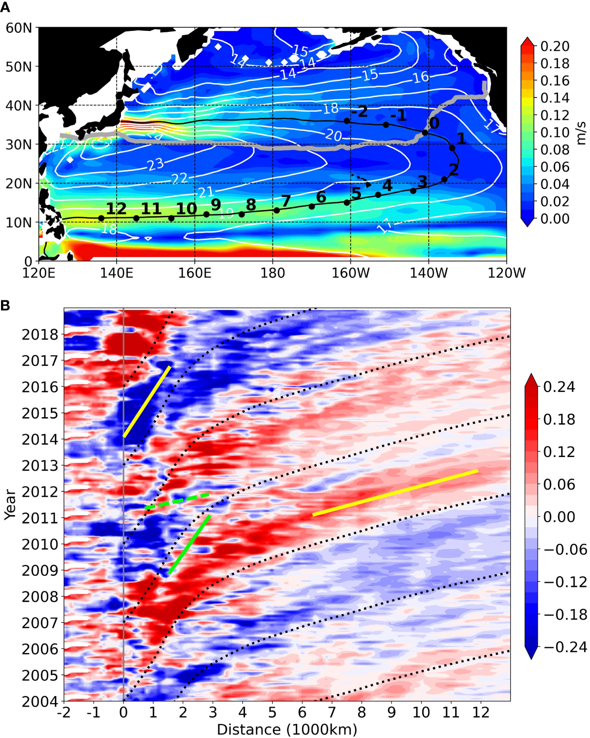 One low-frequency signal that did not reach the western boundary (near 10°N, 125°E) was the negative signal that appeared initially during 2008–2009 (Figure 10). This signal was intruded by the positive signals and almost disappeared near 145°W (point 3 in Figure 10) in 2012. From the slope of the continuous anomalies in Figure 10B, the intrusion may be attributed to a branch of the former positive signal which propagated more slowly (solid green line in Figure 10B; 0.02 m/s at points 1–3) than the geostrophic current (0.02 m/s to 0.05 m/s at points 1–3) and a branch of the latter positive signal that propagated faster (dashed green line in Figure 10B; 0.09 m/s at points 1–3) than the geostrophic current, implying that the anomalies propagated mainly by the mean geostrophic currents but could also be transported by other processes at the same time.