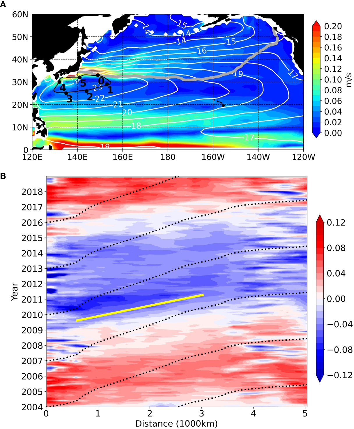 (A) Geostrophic velocity (color) and streamline (white contour) on γ = 25.0 surface (unit = m/s) that was relative to 1500 dbar. Black contour denotes the 19 isopycnal stream function isopleth with positions dotted at every 1000 km distance (the great-circle distance at each pressure point) from the “0” point. The thick gray line denotes the winter outcrop line of the γ = 25.0 surface. (B) Time-distance diagram of the salinity anomalies along the 19 isopycnal stream function isopleth (same as the black contour in a). The dotted black curves denote the advection by mean geostrophic velocity along the streamline, which integrated from the “0” point (gray line). The positions of every 1000 km distance are the same as the dotted points in (A) The yellow lines indicate representative propagation speeds of the anomalies, which are 0.02 m/s and 0.12 m/s respectively. The solid and dashed green lines indicate branches of the anomalies that did not propagate following the mean geostrophic speed, with speed of 0.02 m/s and 0.09 m/s respectively.