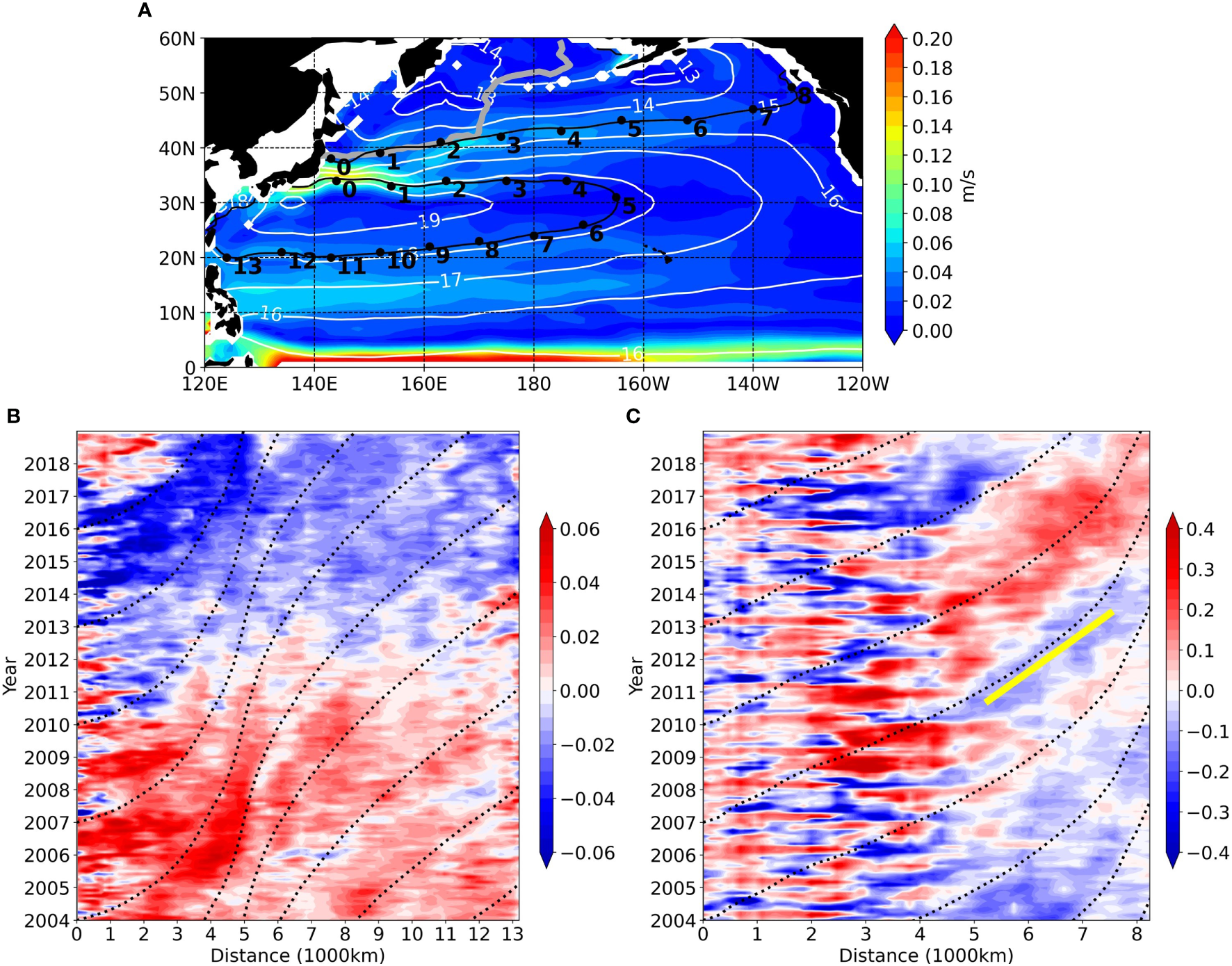 Along the streamline that passed through the STMW (Figure 11), continuous downstream propagations were observed only in the southwestward part of the streamline (points 0–5). Unlike the good agreement found between spiciness anomalies’ propagation speed and the mean geostrophic velocity in the eastern subtropics, the propagation speed of spiciness anomalies in the western subtropics was much faster than the geostrophic current. Calculating from the strongest amplitudes of signals that propagated from the easternmost to the westernmost points (distance of 500 – 3500 km) in ~1.5 years (yellow line in Figure 11B), the propagation speed of spiciness anomalies was about 0.06 m/s. Meanwhile, the mean geostrophic speed was only approximately 0.03 m/s. When we investigated the neighboring streamlines and streamlines on adjacent isopycnals, the transit time of spiciness anomalies from the outcrop lines to the southmost STMW was 1–2 years with a speed of 0.06–0.09 m/s.
