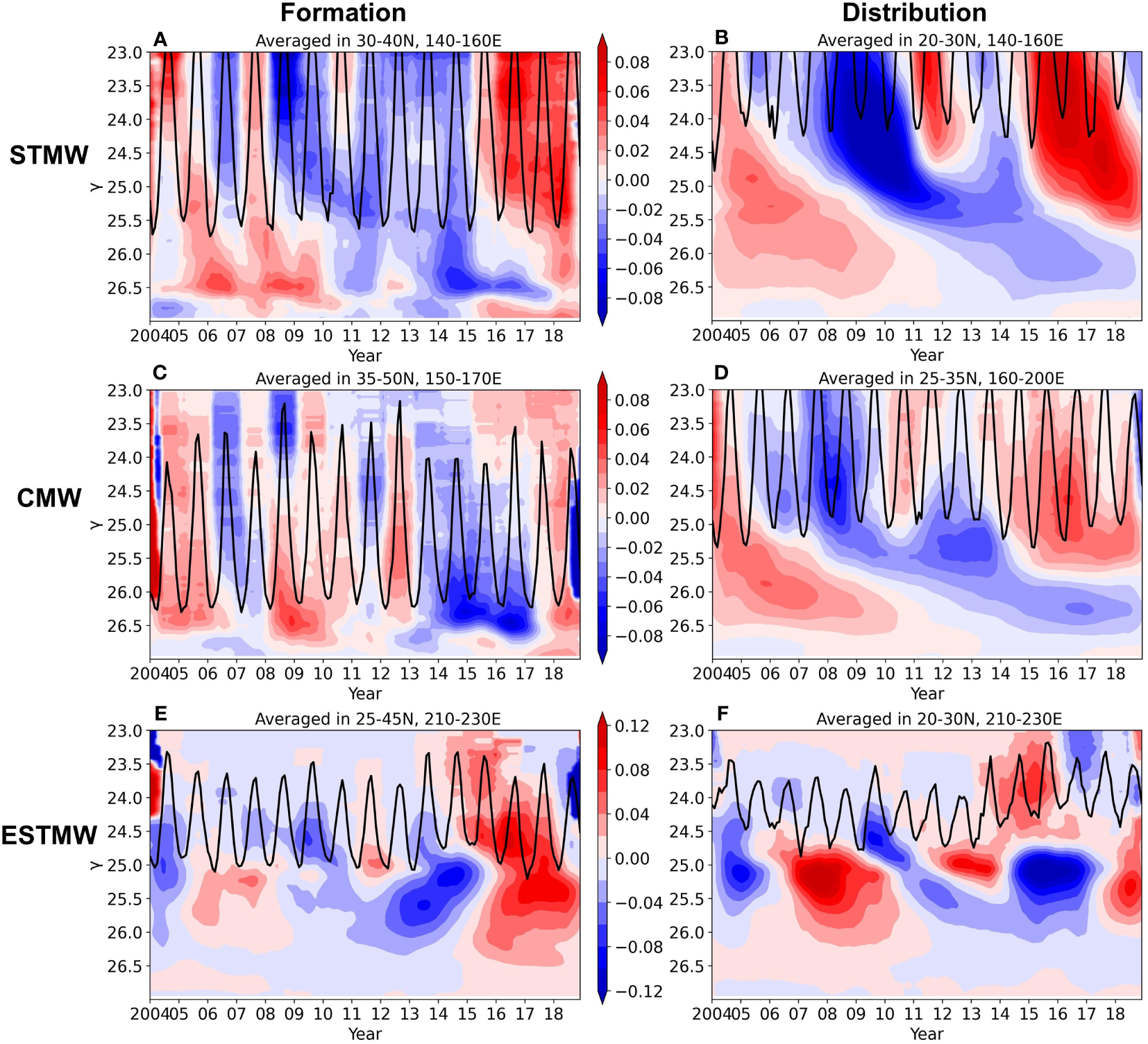 The γ-time diagram for 12-month running average salinity anomalies that were averaged in boxes, which represent the formation and downstream distribution regions of the studied three mode waters. (A) 30–40°N, 140–60°E, (B) 20–30°N, 140–160°E, (C) 35–50°N, 150°E to 170°W, (D) 25–35°N, 160°E–160°W, (E) 25–45°N, 130–50°W, and (F) 20–30°N, 130–150°W, represent STMW formation, STMW distribution, CMW formation, CMW distribution, ESTMW formation, and ESTMW distribution regions, respectively. Black contours denote the potential density of the mixed layer. The latitude ranges in A, C, and E were chosen based on Figure 14.