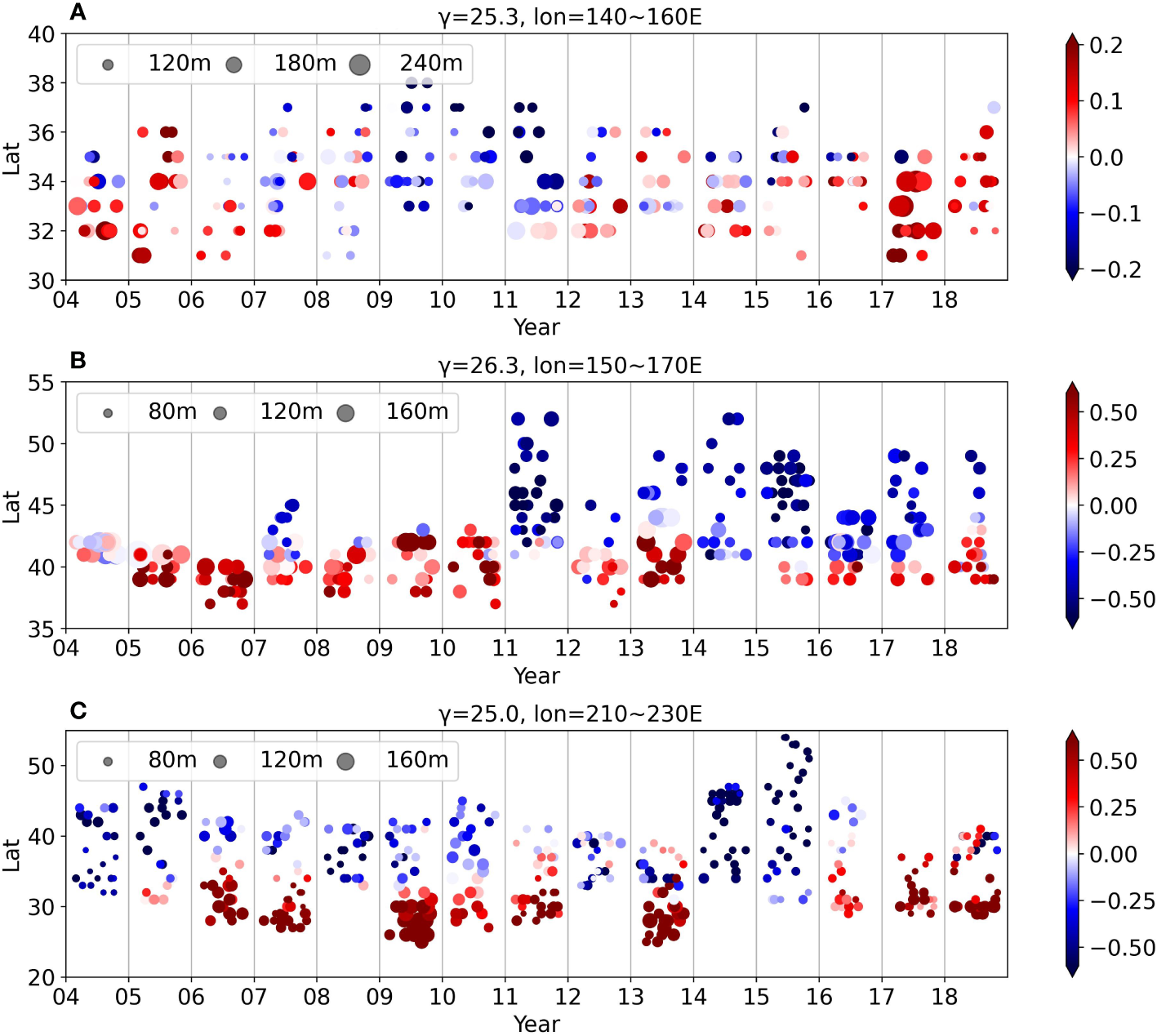 Scatter plots for the latitudes of the grids on late winter outcrop line of the mode water core surfaces in their main formation regions. (A) γ = 25.3 in 140–160°E, (B) γ = 26.3 in 150–170°E, and (C) γ = 25.0 in 130–150°W. Colors in the scatters indicate salinity anomalies in late winter mixed layer, which were calculated by the salinity at a plotted grid subtracted by the climatological salinity that was averaged at the appropriate longitude on the outcrop line. Sizes of the scatters indicate late winter MLD. The horizontal positions of the scatters are distributed randomly within the bin of each year to avoid overlap.