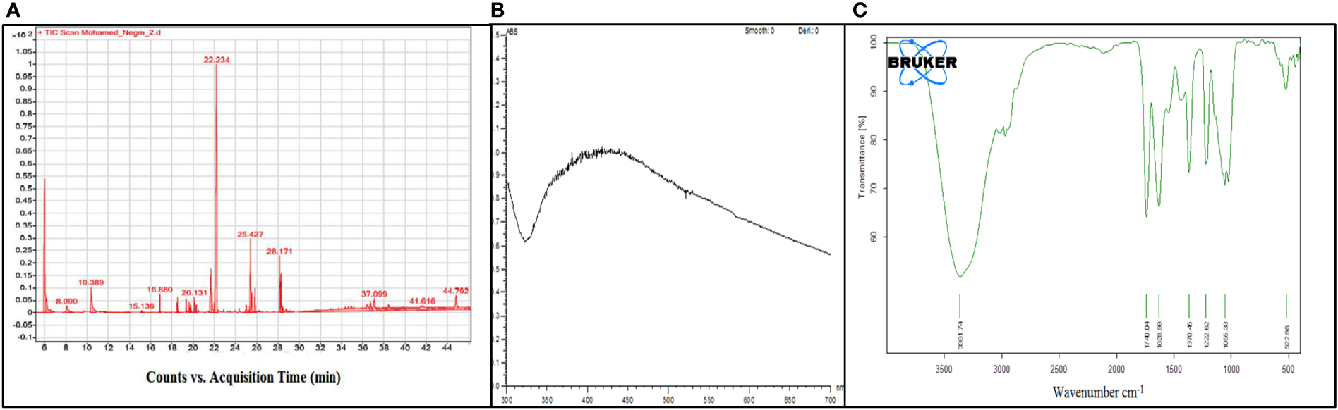 (A) GC-MS analysis of the observed components. (B, C) UV–visible and FTIR spectra of AgNps synthesized from the Grateloupia sp. alga-distilled water extract.