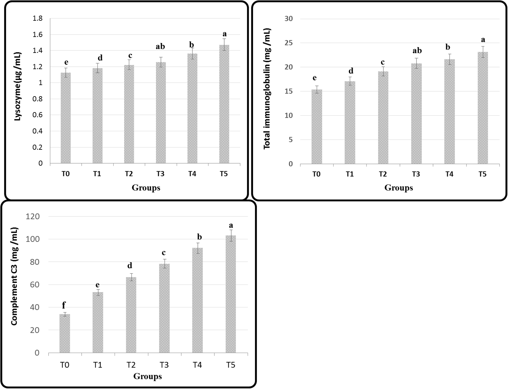 Innate immunity indices in serum samples were calculated. Micrococcus luteus was used as a substrate to estimate lysozyme (LYZ) actions turbidimetrically (Ellis, 1990). A unit of LYZ actions as the number of enzymes that cause the decline of 0.001OD/min in absorbing 1 ml of serum is determined. The total immunoglobulin (total Ig) concentrations were estimated following Siwicki and Anderson (1993). Moreover, they used commercial immune-turbidimetry to estimate complement C3 activity (Tang et al., 2008).