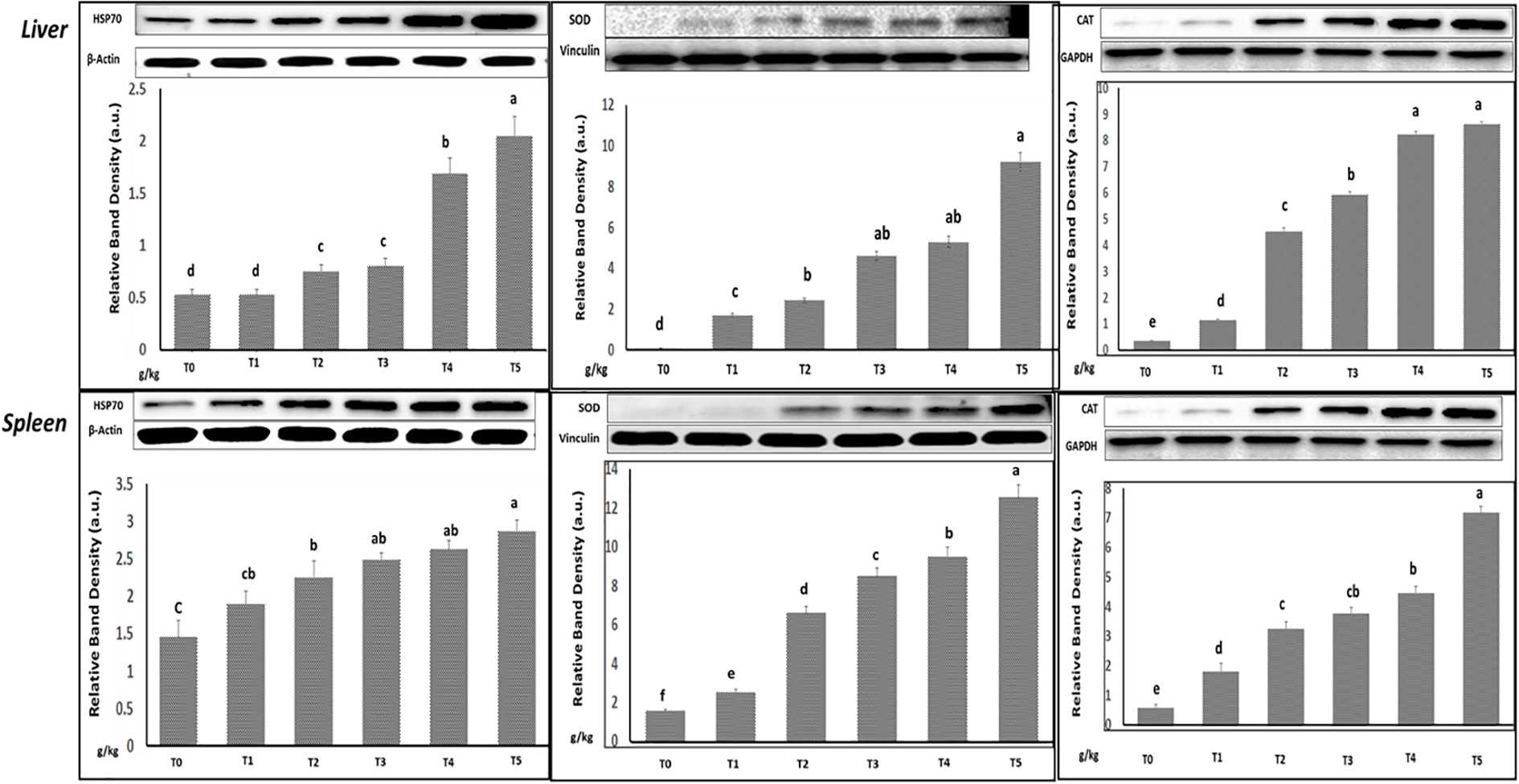 Forty micrograms of protein extracted from O. niloticus, liver or spleen, was dissolved over 8%–12% polyacrylamide gels and transferred to a nitrocellulose membrane. The authors blocked each blot in a blocking buffer (7% nonfat dry milk/1% Tween 20; in 20 mmol/L TBS (pH 7.6)) for 1 h at room temperature before incubating it with primary antibodies Hsp70 (Abcam, USA), CAT (Biorbyt, USA), SOD (Sigma-Aldrich, USA), TNF-α (Thermo Fisher Scientific, USA), IL-10 (Santa Cruz Biotechnology, USA), IL-9 (Abcam, USA), GAPDH, β-actin, and vinculin (Santa Cruz Biotechnology, USA) in blocking buffer for 2 h at room temperature or overnight at 4°C, followed by incubation with anti-rabbit IRDye 800CW-labeled secondary antibody (Abcam, USA). Blots were subjected to improved chemiluminescence (Thermo Scientific Pierce, USA) and autoradiography using the BioRad imaging system (Hercules, CA). Quantity One (BioRad) was used by the authors to perform a densitometric measurement of the bands in the Western blot analysis. The treatment protocol was carried out at least three times, and the analysis of individual protein expressions was carried three times and with similar results (Chen et al., 2017).