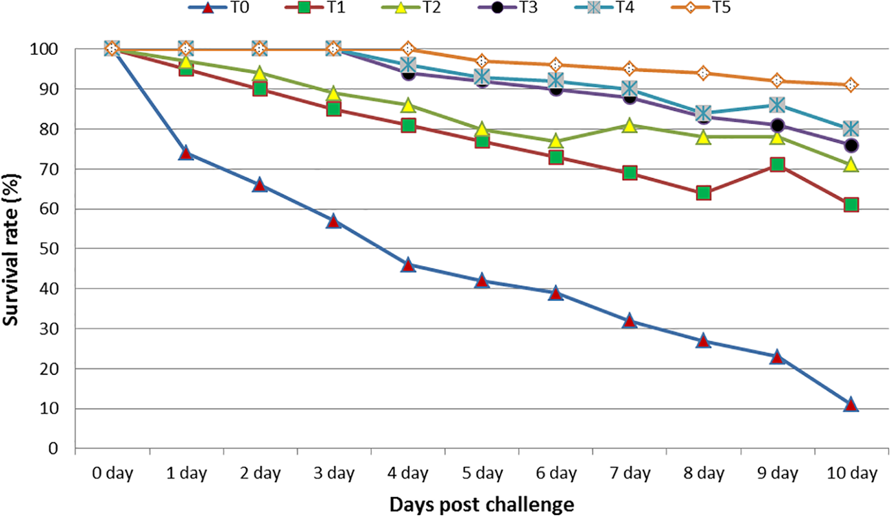Aeromonas hydrophila was isolated and prepared according to Abdel-Razek et al. (2019). At the end of the feed trial, fish representing each subgroup had 10 fish in 100-L tanks in replicas. The first subgroup was challenged with pathogenic A. hydrophila by a sublethal dose illustrated by Schäperclaus (1992), in which they intraperitoneally (IP) injected a dose of 0.1 ml of 24 h broth from virulent A. hydrophila (5 × 105 CFU/ml). They IP injected the second subgroup with 0.1 ml of saline solution as the control group. They fed fish on matching diets throughout the challenge test in each treatment. Mortality data were utilized to estimate the relative live percentage (RLP) following Amend (1981) equation: