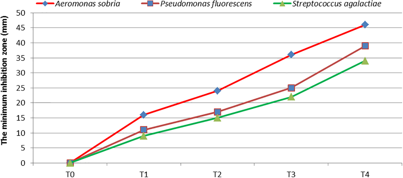 Four GNS levels (0.1%, 0.2%, 0.5%, and 1.0% ml/L) were investigated to identify the antibacterial ability of three chosen bacteria. The three bacterial strains tested were Aeromonas sobria, Pseudomonas fluorescens, and Streptococcus agalactiae from the Department of Microbiology, Faculty of Science, Al-Azhar University, Egypt.