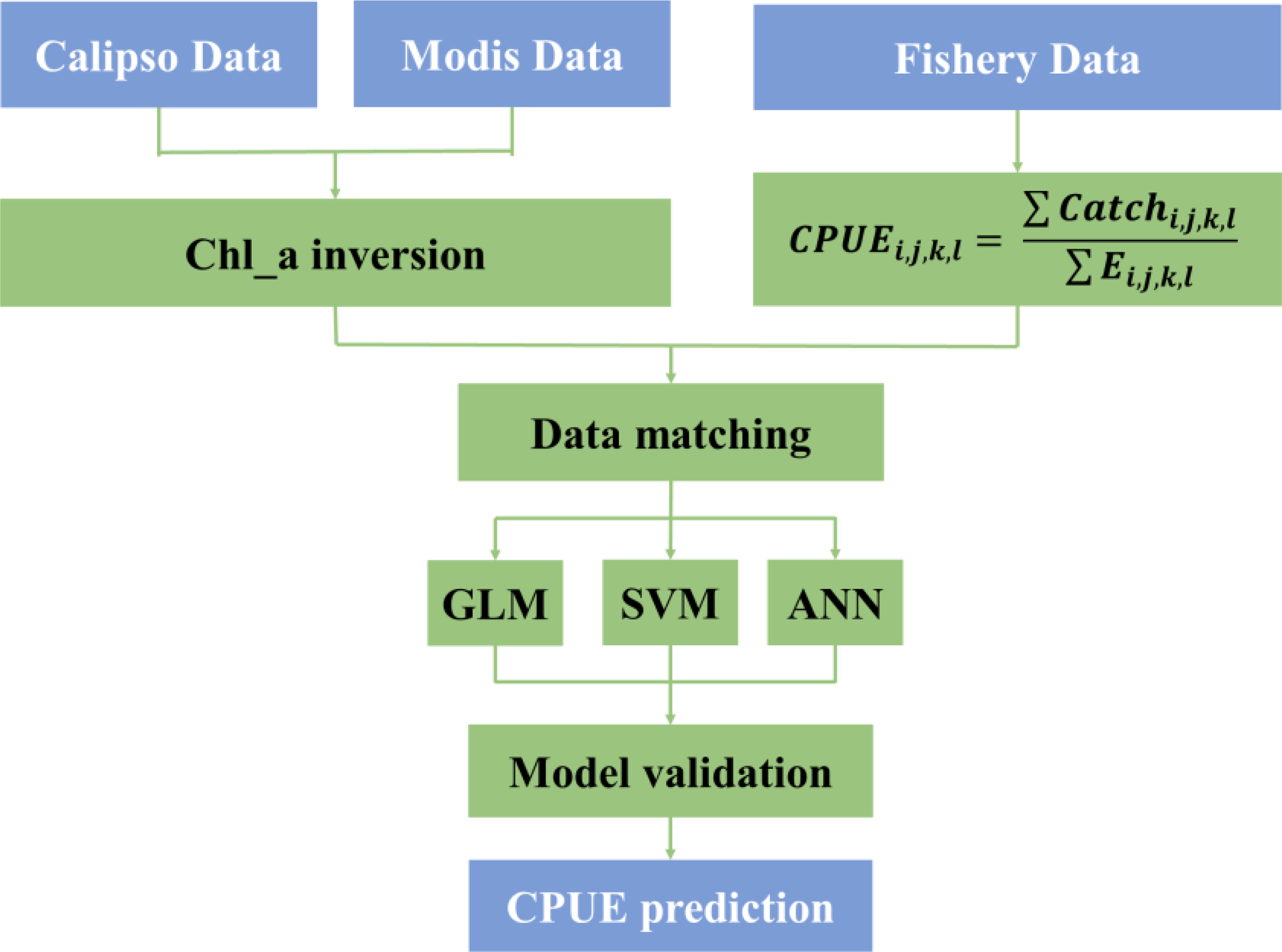 The research method mainly includes three steps: Chl_a inversion, tuna CPUE modeling and model comparison, and Antarctic krill CPUE standardized modeling. Major research processes such as data acquisition and analysis are illustrated in Figure 2. First, the particulate backscatter coefficient (bbp) of CALIPSO is preprocessed, and the correlation between bbp and Chl_a of MODIS is established using ANN model, and Chl_a inversion is performed according to the model. For fishery data, CPUE is calculated according to Equation 1. Then, Chl_a, SST and CPUE are matched based on the latitude and longitude resolution (1°×1°) of the fishery data. The matched data are then brought into the GLM, SVM and ANN models to compute the relationship between environmental data and CPUE, and the effects of the three models are compared and verified. Finally, the model with better performance is selected for CPUE prediction. Chl_a, SST and CPUE are matched against the latitude and longitude resolution (1° × 1°) of the Antarctic krill data. The nominal CPUE and predicted CPUE were collated and their correlations were calculated by calculating the residual sum of squares (SSE), coefficient of determination (R2), degree of freedom (df), root mean square error (RMSE), correlation coefficient and p-value, respectively. The predicted CPUE and nominal CPUE were then tested for correlation using ANN model output and CPUE predictions. Section 2.3.1 introduces the calculation process for CALIPSO inversion Chl_a; Section 2.3.2 introduces the calculation principle of GLM; Section 2.3.3 introduces the calculation principle and calculation method of artificial neural network; finally, Section 2.3.4 introduces the calculation principle and calculation method of SVM.