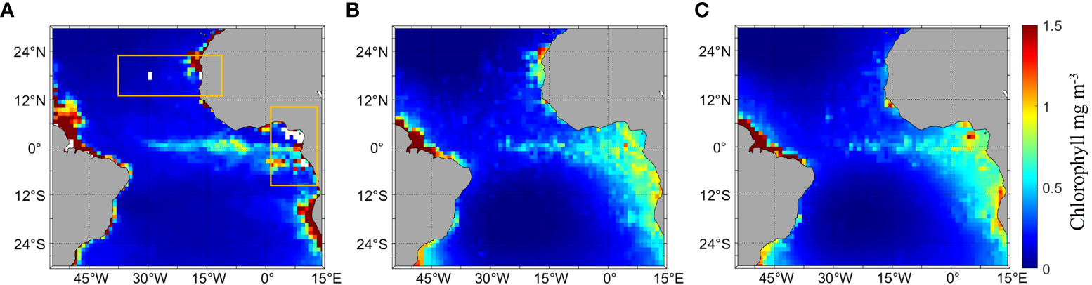 CALIPSO effectively inverted the daytime and nighttime Chl_a distribution and retrieved data effectively filled in the missing parts of MODIS. Figure 3 shows the comparison of the Chl_a distribution of MODIS and CALIPSO in the study area and the distribution of CALIPSO-derived Chl_a during day and nighttime. Figure 3A shows the Chl_a data of MODIS, and it can be seen that there are significant missing data in the yellow boxes, especially near the Gulf of Guinea (0°-15°E, 6°S-6°N), where more data are missing. Near the equator, Chl_a is distributed like a tape (30°W-12°E, 6°S-5°N), and the Chl_a value is higher in the coastal areas (60°W-45°W, 0°-12°N; 17°W-15°W, 18°N-24°N; 7°E-15°E, 24°S-12°S). Figure 3B shows the Chl_a data of CALIPSO obtained by inversion using ANN based on the relationship between Chl_a of MODIS and bbp of CALIPSO. The missing area data can be filled by the inversion of CALIPSO data, and the trend of the Chl_a distribution is roughly similar to that of MODIS. Compared with Figure 3A, the distribution of Chl_a is similar along the northeast coast of Brazil, and the distribution of Chl_a is wider offshore of Africa (0°-15°E, 24°S-6°N) with a lower concentration than that in Figure 3A. Figures 3B illustrate that the overall distribution of Chl_a is generally consistent, with a clear band distribution. Compared to the daytime (Figure 3B), Chl_a is higher at night along the northeastern coast of Brazil (45°W-30°W, 6°S-0°N), significantly lower along the coast of Mauritania (23°W-15°W, 24°S-6°N), and higher and more concentrated in the Gulf of Guinea (0°-15°E, 0°-6°N). The results of the correlation analysis show an RMSE of 0.6129 and R2 of 0.8253 for daytime and nighttime Chl_a data.