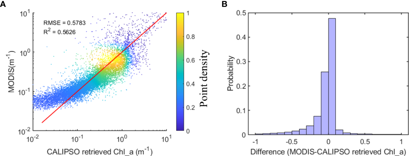 Statistical analysis was performed on the Chl_a values of MODIS and CALIPSO, and the results are shown in Figure 4. Correlation analysis of the Chl_a from MODIS and CALIPSO values had RMSE of 0.5783 and R2 of 0.5626 (see Figure 4A). From the frequency distribution of the errors (see Figure 4B), the distribution basically conforms to a normal distribution with errors ranging from -0.1 to 0.1, where the probability of 0 to 0.1 is close to 50%.