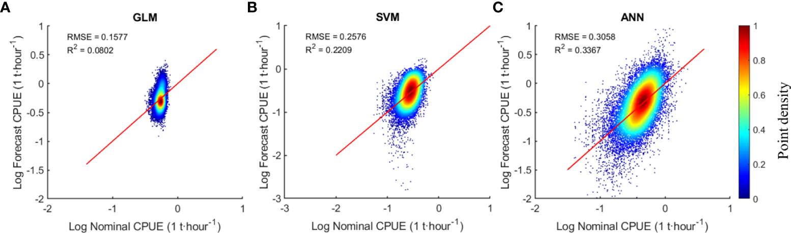 Three models (GLM, ANN, SVM) were used to model Atlantic bigeye tuna and predict CPUE. The results of the regression analysis for three models compared to the nominal CPUE are shown in Figure 5. The results indicate that ANN has the highest R2 of 0.34 among the three models, followed by SVM with 0.22, and GLM with the lowest of 0.08. Because ANN and SVM are both non-linear modes, and ANN model performs better than SVM, and SVM is rarely used in CPUE researches, therefore, ANN model and GLM model are selected for further comparison in the following.