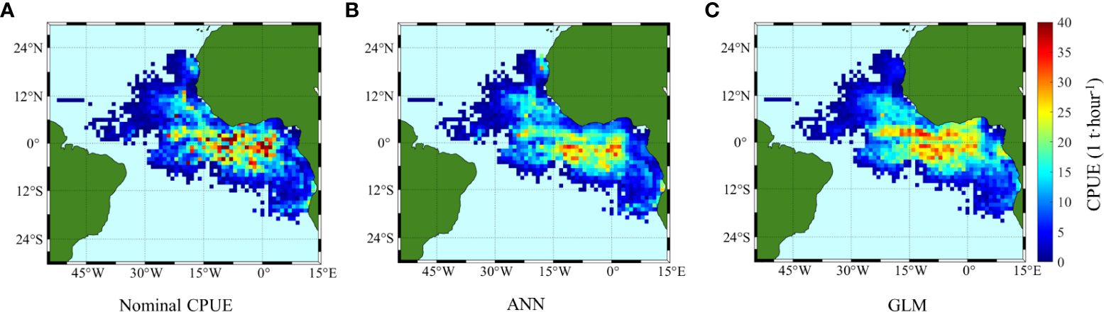 The trend in the distribution of CPUE predicted by ANN and GLM is roughly consistent with the original nominal CPUE, with relatively high predictions by GLM. Figure 6 shows the distribution of nominal CPUE and the CPUE predicted by ANN and GLM, including the cumulative CPUE values for all months from 2008 to 2015. As shown in Figure 6A, the areas with high catches are mainly located near the equator. Among them, there are two obvious high-production areas in Guinea Basin (5°W-4°W, 5°S-3°N) and the southern part of the Sierra Leone basin (13°W-8°W, 4°S-2°N), and a small high-production area in southern Cape Verde (13°W-18°W, 9°S-13°S). As seen from Figure 6B, compared to the GLM (Figure 6C), the ANN-predicted CPUE distribution is closer to the nominal CPUE distribution but with slightly lower values. For example, Figure 6B shows that there are two high-yielding areas in the southern Guinea Basin and Sierra Leone Basin, similar to Figure 6A. In Figure 6C, the GLM predicts a larger area of high production areas, mainly concentrated in 20°W to 3°E, 6°S to 4°N.