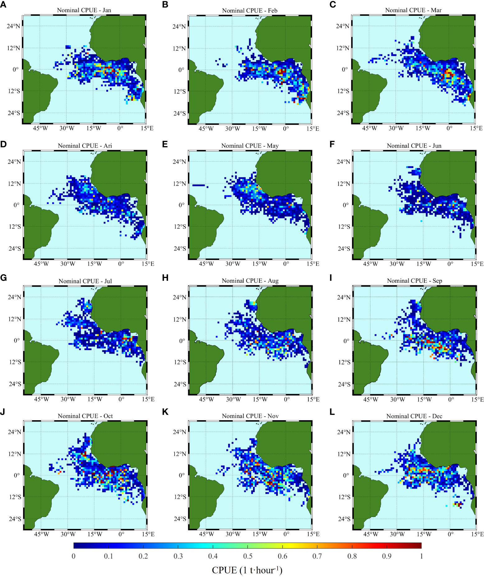 Climatology monthly spatial distribution of the original measured CPUE; (A–L) correspond to January to December, respectively.