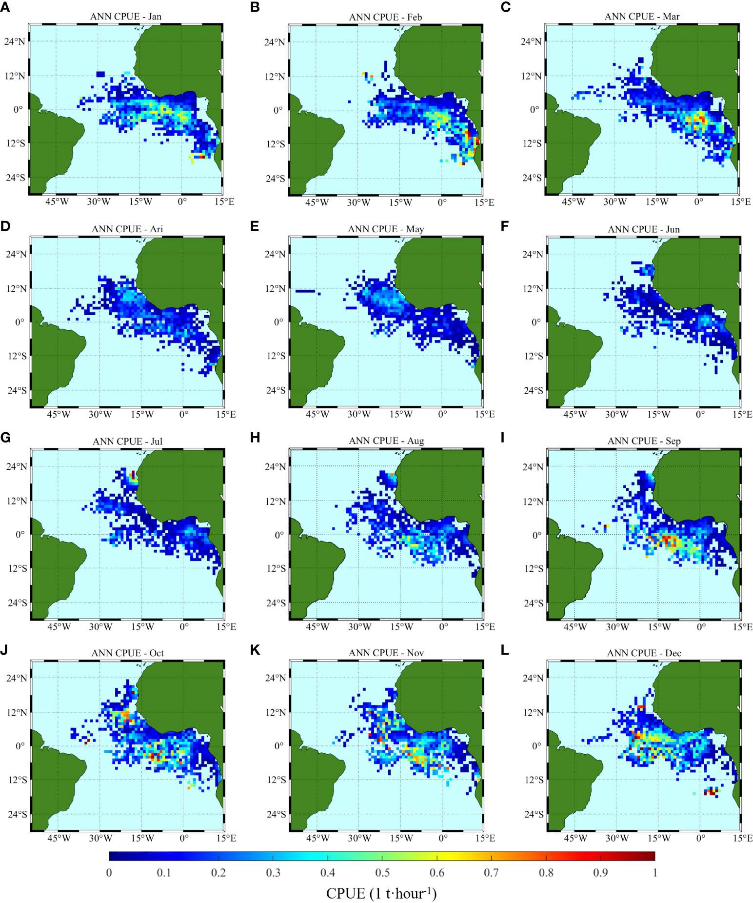 Climatology monthly spatial distribution of CPUE predicted by ANN, (A–L) correspond to January to December, respectively.