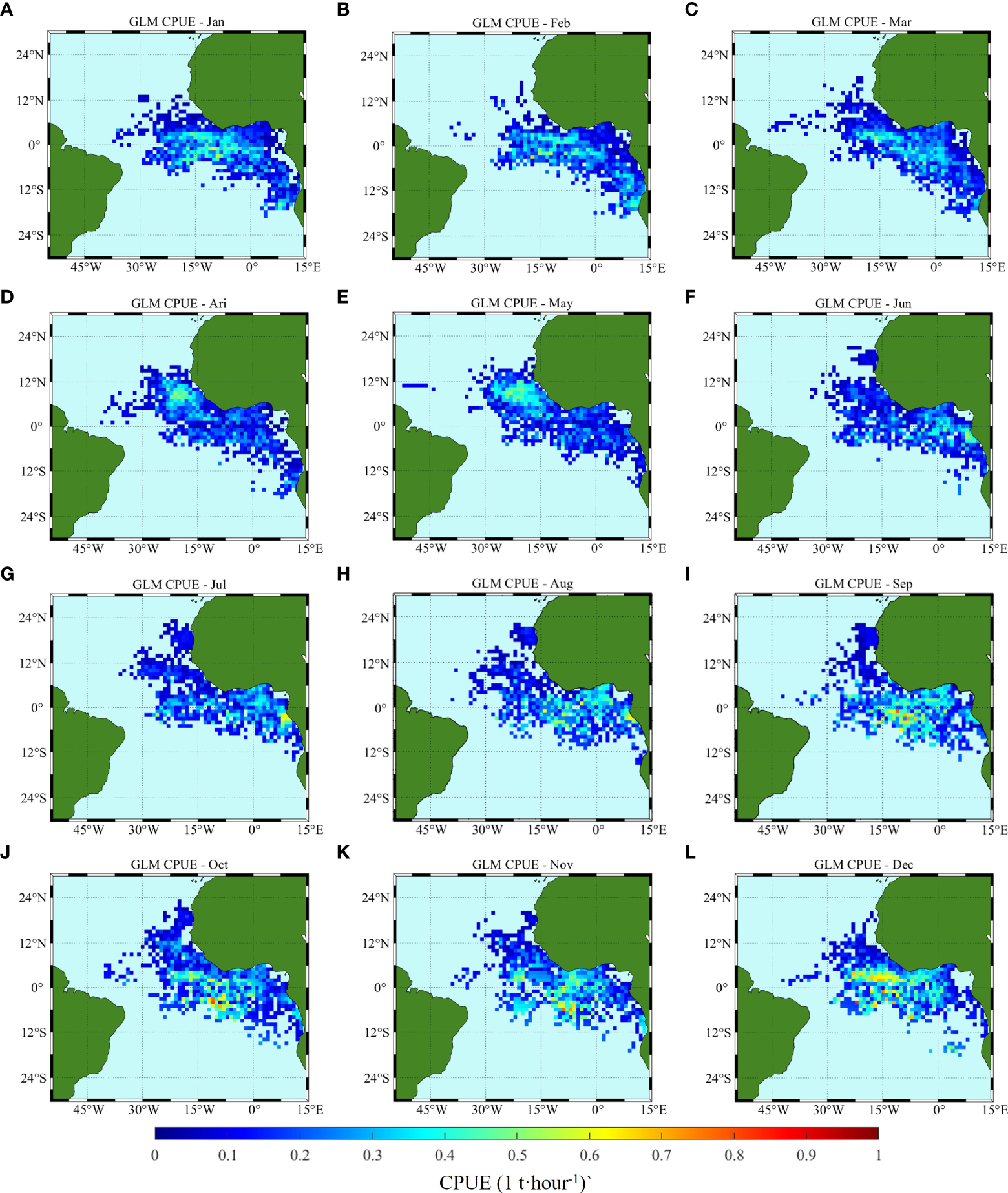 Climatology monthly spatial distribution of CPUE predicted by GLM, (A–L) correspond to January to December, respectively.