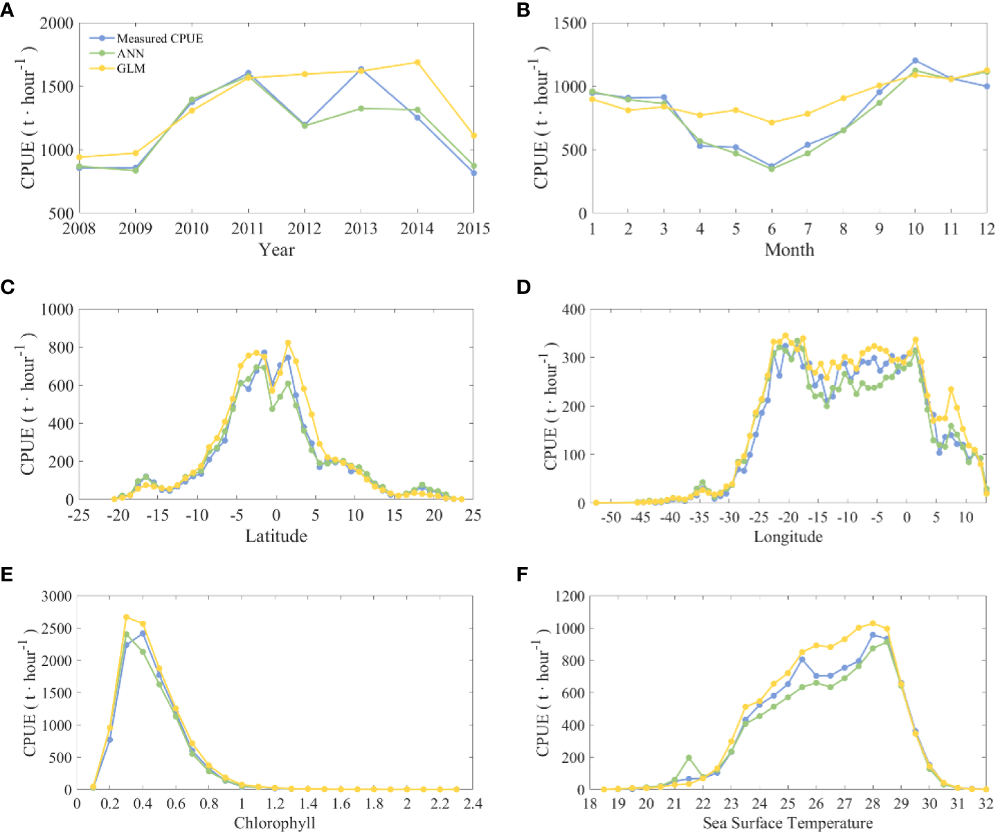 Statistical chart of the cumulative amount of CPUE calculated by different models and nominal CPUE according to different explanatory variables. The corresponding explanatory variables in (A–F) are year, month, latitude, longitude, chlorophyll, and sea surface temperature. The blue line is the nominal CPUE, the green line is the CPUE predicted by ANN, and the yellow line is the CPUE predicted by GLM.