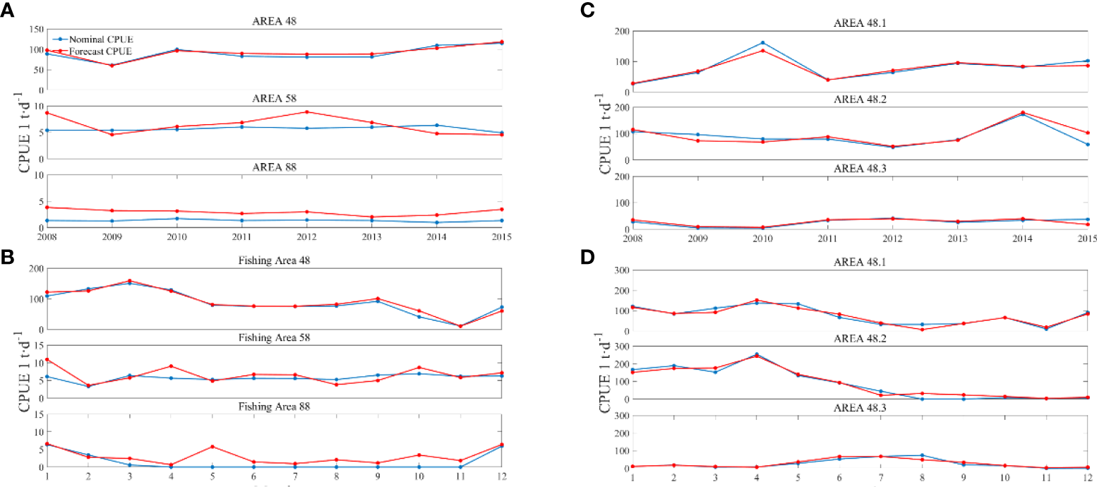 The catch data of Antarctic krill (Euphausia superba) from 2008 to 2015 were selected as the polar model training data. Antarctic krill are a species of krill that live in the Antarctic waters of the Southern Ice Ocean, and fishing operations are mainly in the South Atlantic region. Figure 1B shows a map of the main fishing areas in the Antarctic region from the Commission for the Conservation of Antarctic Marine Living Resources website (CCAMLR, 2017). The fishing areas are divided into three main Fishing Area (FA) 48, 58 and 88, and each main fishing area is divided into several subareas. This paper focuses on modeling and predicting CPUE for the three main fishing areas and further investigates the CPUE variation in the three Sub Fishing Area (SFA) 48.1, 48.2 and 48.3 of FA 48.