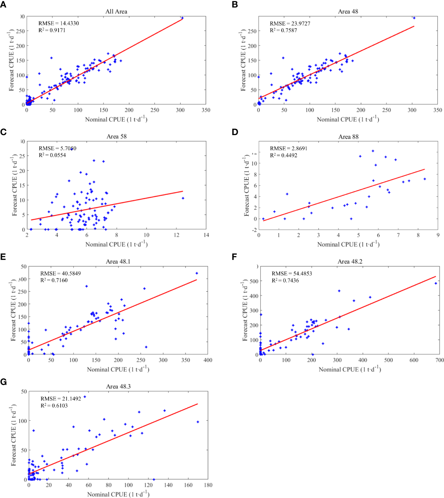 From the comparison of model prediction results, the distribution of CPUE predicted by ANN and GLM is consistent with the measured changes and trends. The GLM predicted values show a larger area of high production area, but the CPUE value in some areas is lower than that of ANN. GLM predicts that CPUE is lower than 0.5 t/h from January to June, and CPUE will exceed 0.6 t/h in equatorial regions after July. ANN predicts that CPUE is lower than 0.5 t/h only in March to June, and CPUE will be higher than 0.6 t/h in some regions of equatorial and southern equatorial regions in other months, even up to 1 t/h in December near the Angola basin (2°E-6°E, 18°S-16°S.).