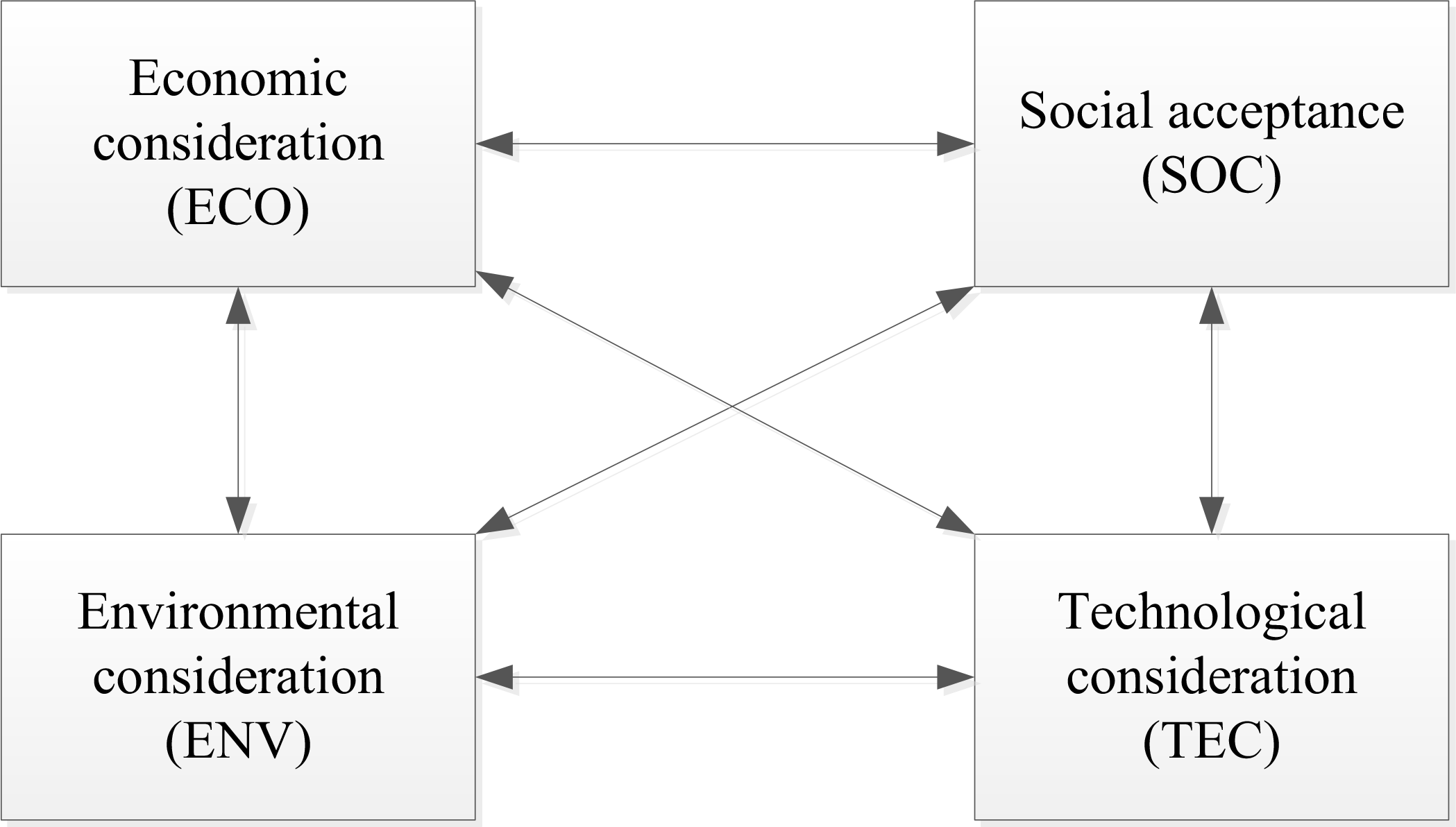 The discipline of MCDM was first proposed by Zionts (1979). The MCDM method is used by Pohekar and Ramachandran (2004) to address the sustainable energy management issue with conflicting and multiple objectives. Huang et al. (2011) carried out a literature review on the MCDM application in the environmental impact assessment considering of trade-offs between social, political, environmental and economic aspects. Khalili and Duecker (2013) proposed a series of clean production projects by designing a sustainable environmental management system, which considers the environmental, industrial, economic and social criteria through the whole decision-making process. Rabbani et al. (2014) developed a new approaching by coupling MCDM method with sustainability balanced scorecard method to evaluate the oil producing companies’ performances. Carli et al. (2018) utilized MCDM method analyzing the sustainable development of energy, water and environmental systems in a city. An integrated MCDM method was also used by Nzotcha et al. (2019) to select an optimal hydro-energy storage plant site through a sustainable development perspective. The method of MCDM has been adopted in this research, following its successful application to a number of industrial fields (such as coastal mining (Vaghela et al., 2018), sustainable project planning (Pohekar and Ramachandran, 2004; Abdel-Basset et al., 2021) and manufacturing system scheduling (Erdogan et al., 2019)) to address similar multiple criteria problems (Ho et al., 2010; Rezaei, 2015). Following review of the existing literature, when applying the MCDM theory in DSM system, three key practices are identified: MCDM method selection, evaluation criteria determination and the calculation of criteria weights (Kahraman, 2008).