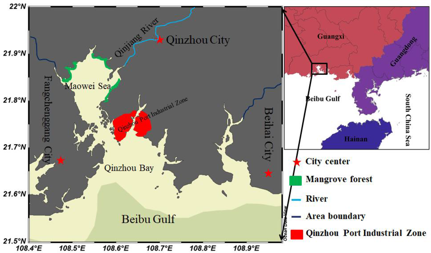 Qinzhou (Figure 1) is located in southwest China, next to Nanning, the capital of Guangxi, in the north and south of the Guangxi Zhuang Autonomous Region and along the Beibu Gulf Coast. It is linked to Beihai City and the Yulin area in the east and Fangchenggang City in the west. Qinzhou is located close to the broad Qinzhou Bay, with a sea area of 908.37 km2 (Gu et al., 2015). Qinzhou Bay is part of the Beibu Gulf, South China Sea, and is located in the northernmost part of the fish-rich Beibu Gulf. Qinzhou Bay starts from Yingluo Port of Hepu County in the East and ends at Beilun estuary of Fangcheng County in the west, with a coastline of 1478 km. In 2020, Qinzhou had a permanent resident population of about 3.3 million, a gross domestic product (GDP) of 13.87 ten billion yuan, and has gradually built a development pattern dominated by five industries, i.e., petrochemical, equipment manufacturing, electronic information, food processing, and papermaking and biomedicine (Xu et al., 2019). These industries included China-Malaysia Qinzhou Industrial Park, China Shipbuilding offshore wind power industrial base, Jingui pulp and paper enterprises, and the ASEAN natural medicine and plant medicine industry development platform. Qinzhou is a key developmental area for urban construction and economic growth of the future Beibu Gulf Economic Circle (Xu et al., 2019).