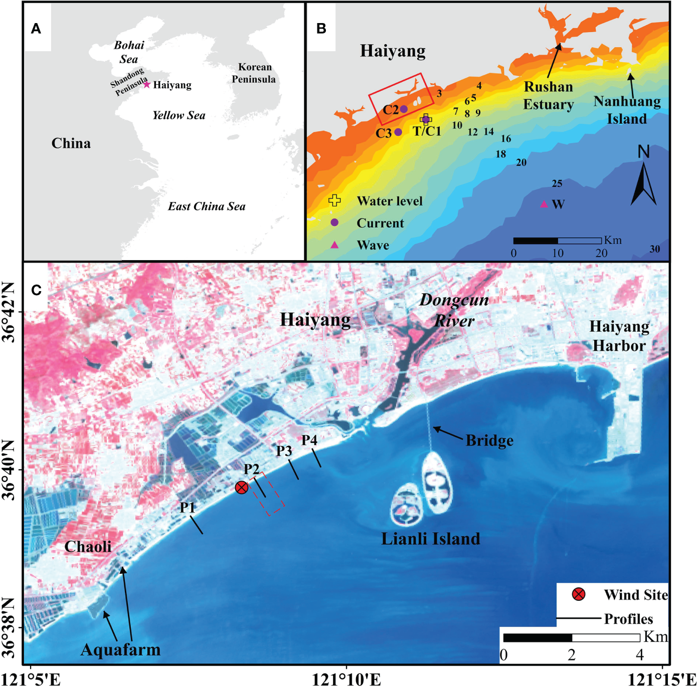 Location of the Haiyang beach indicated by the red pentacle (A). Location of gauging station T, current observed stations C1 to C3 and wave observed station W, and the topography of the study area (B). Layout of the observed profiles P1 to P4 as shown by black solid lines, and the background is a standard false-color Landsat image. The red dashed area represents the XBeach model domain, and the red dot with black cross represents the site of calculated wind conditions at Haiyang beach (C).