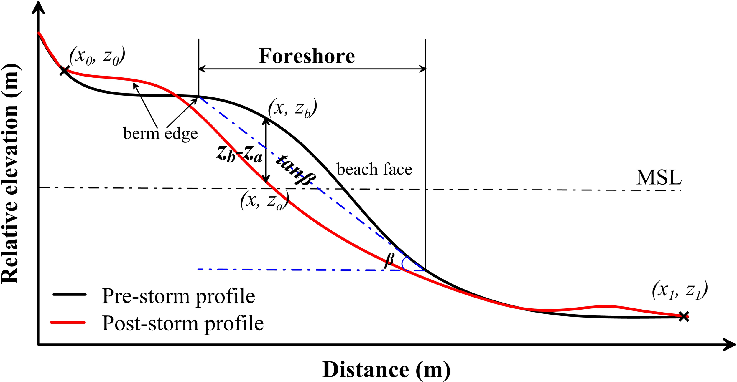 The beach profile slope (tan β) is used to evaluate the impact of a storm, and is defined as the tangential angle of the foreshore between the edge of the berm and the bottom of the beach face, as shown in Figure 2. Furthermore, Qi et al. (2010) proposed the mean profile change (MPC) to quantify TC impact intensity. It is the absolute value of the averaged profile change before and after a TC, expressed by the following equation: